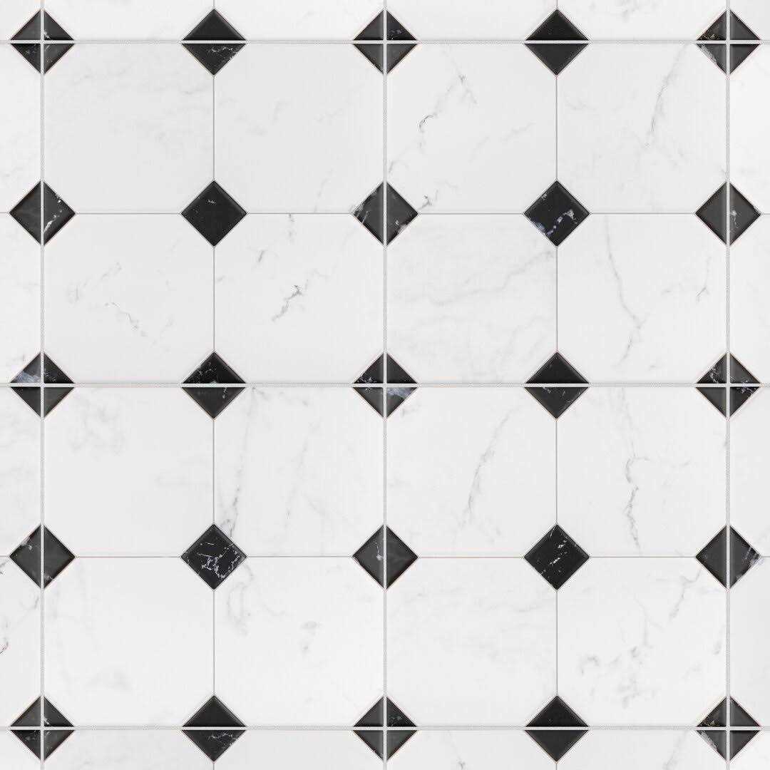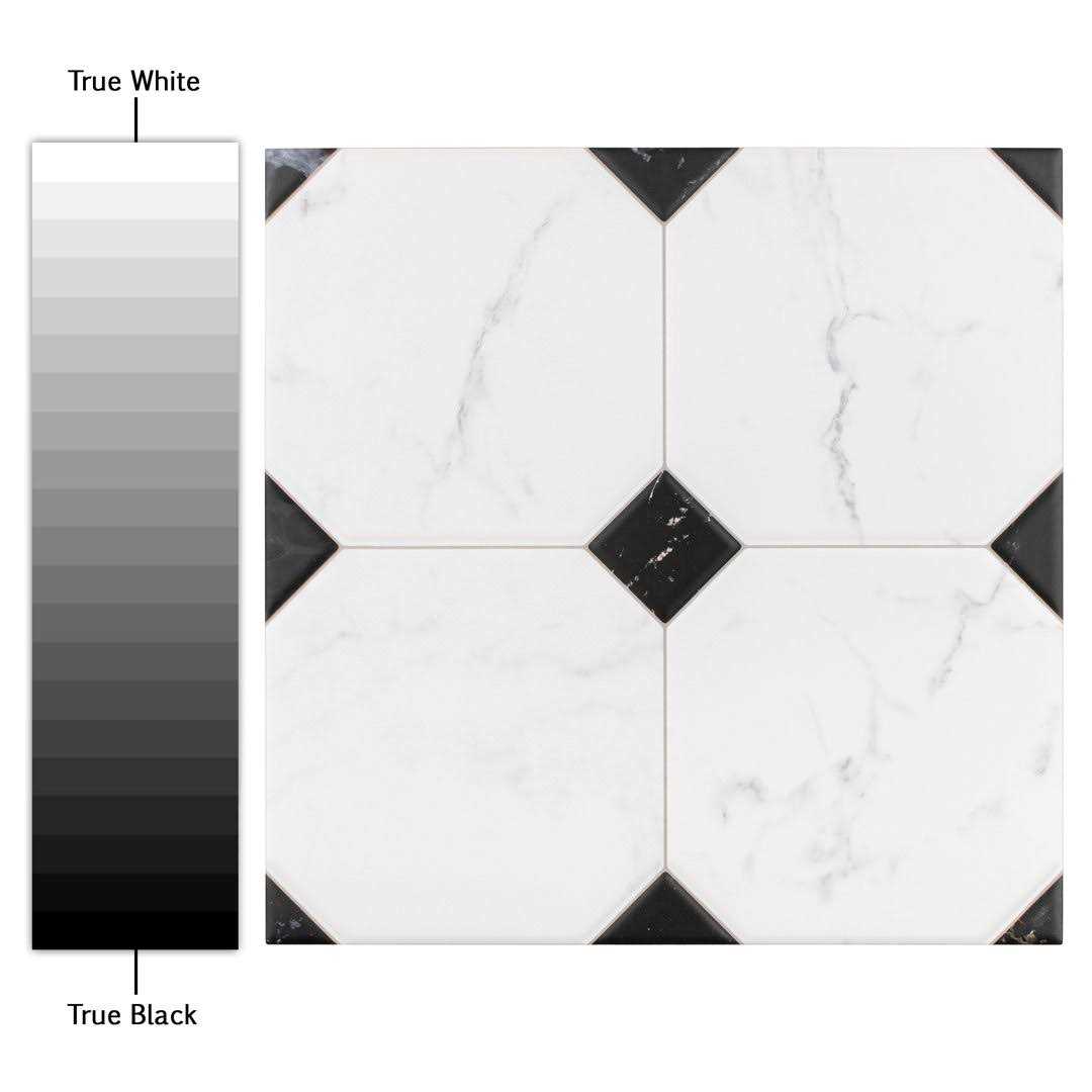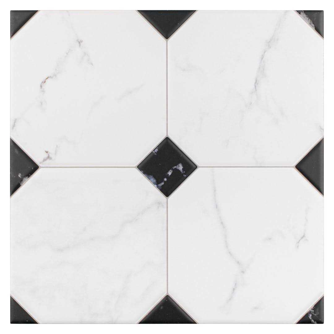 Emulating the timeless beauty of marble in an easy to maintain material, Betera Jet Series 13″x 13″Ceramic Patterned Wall & Floor Tile brings functional sophistication into any living space. Set on a smooth, matte base glaze, white octagons are accented by black tringles in each corner with light and dark grey veining striations that sporadically flow throughout each piece for added authenticity. Save time and labor spent arranging individual squares and instead install these durable ceramic slabs, which have squares separated by scored grout lines. The scored grout lines can be grouted with the color of your choice to further customize your installation. Its glazed and durable features make this tile an ideal choice for commercial and residential indoor installations including kitchens, bathrooms, showers and entryways. Tile is the better choice for your space. This tile is made from natural ingredients, making it a healthy choice as it is free from allergens, VOCs, formaldehyde and PVC.