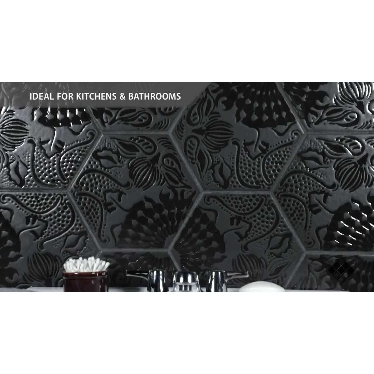 Inspired by renowned Spanish Catalan Architect Antoni Gaudi, our Gaudi Lux Hex Black 8-5/8 in. x 9-7/8 in. Porcelain Floor and Wall Tile offers patterned reflections that feature a combination of original designs and his passion for nature in a bold black color. These enlarged hexagons have a handmade appearance through textured designs and subtle imperfections that make it look like each tile was handcrafted. These dimensional porcelain tiles have an irregular embossed surface with a mixed finish, providing a beautiful visual experience. Its impervious and frost-resistant features make this an ideal tile for both indoor and outdoor residential use, including backsplashes, bathrooms, showers and kitchens. This tile is a perfect choice on its own or paired with other products in the Gaudi Collection. Tile is the better choice for your space. This tile is made from natural ingredients, making it a healthy choice as it is free from allergens, VOCs, formaldehyde and PVC.