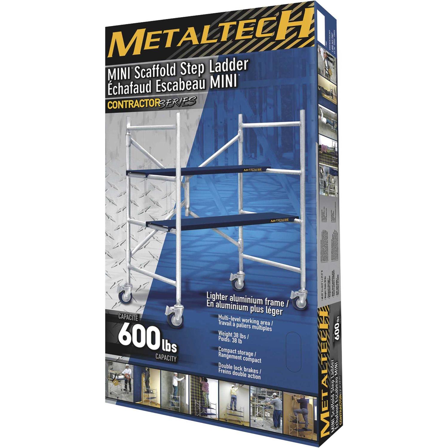 The Metaltec Alu Series 4 Mobile Aluminum Folding Scaffold is a scaffold system that can also be used as a convenient cart for hauling equipment and heavy loads to and from job sites. With its aluminum construction, this scaffold is both resistant to corrosion and lighter than the steel models that are available on the market. Weighing just 42 pounds. This scaffold system is 3 feet 11 inches tall, 22.25 inches long and 3 feet 6 inches wide. With its multiple levels, the scaffolding system also doubles as a working area or as storage space for additional items while working on a project. With its convenient casters, the scaffold can be easily moved from place to place whether used for scaffolding or simply to transport items to the worksite. This model has a 600 pound total weight capacity and can be easily assembled by one person. The process involves simply screwing the casters into place, flipping the scaffolding back to the upright position and expanding it to the open position before putting the platforms in place. When the scaffolding unit is not in use, the unit can be easily disassembled and folded to a more compact design for easy storage.