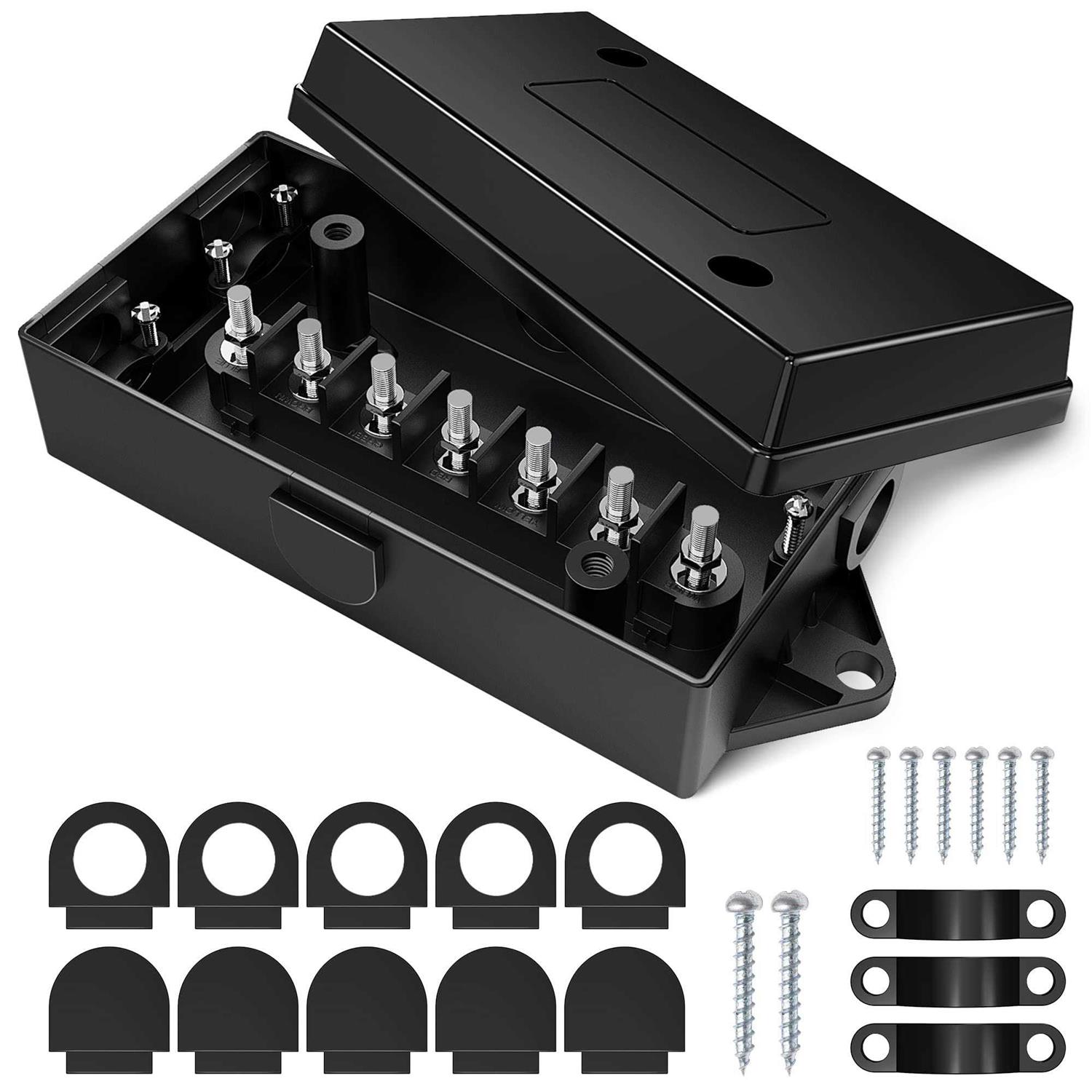 MICTUNING 7 Way Electrical Trailer Junction Box – 7 Gang Trailer Wire Connection Box Weatherproof for Rewiring Camper RV Caravans Boat Light 7 Way Trailer Wire Connectors 7 Way Plug Trailer Cord 7 Way Plug Trailer Cord 7 Way Trailer Extension Cable Trailer Cord 4-Way Flat to 7-Way Trailer Adapter 7 pin to 5 pin Trailer Adapter MICTUNING 7 Way Trailer Junction Box Keeps Your Trailer Wiring Nice And Tidy This Trailer Wire Connection Box perfect for mounting on your trailer to give you easy access to the wiring connections. Makes everything so much easier for diagnosis and troubleshooting when you need to replace a wire. Great choice when you are upgrading old trailer wiring and add accessories circuits to your trailer! Best Sealing Performance A sturdy plastic housing with seven terminal studs provides a weatherproof protection to organize your trailer wiring. The box came with 4 closed and 4 open rubber grommets, give you multiple practical wiring options, making the whole junction box waterproof, dustproof and corrosion resistant. No Wrong Wiring There are specific color name printed on the top of screws, easy to identify and makes working or diagnosing electrical problems much easier Very convenient for wiring up turn light, brake signal lamp, reverse light and other accessories, perfect for your RV, trailers, camper, caravans, food vans and other towed vehicles. Blue – Electric Brake Brown – R Stop & Turn Green – Tail & USC Red – L Stop & Turn Yellow – Center AUX Black – 12V Charge Line White – Ground Seven Terminal Studs Junction Box with seven terminal studs provide a fast and easy way for wires connection, keeping all your trailer wiring in order Easy Identification Specific color name printed on the top of screws for easy identification Excellent Meterial Durable plastic housing for better seal, keep out moisture and dust Read more Product Features TIDY TRAILER WIRING – A sturdy 7-Port Trailer Junction Box with seven terminal studs provide a fast and easy way for wires connection, keeping all your trailer wiring in order QUICK IDENTIFICATION – Specific color name printed on the top of screws for easy identification. Blue – Electric Brake, Brown – R Stop & Turn, Green – Tail & USC, Red – L Stop & Turn, Yellow – Center AUX, Black – 12V Charge Line, White – Ground UPGRADE TRAILER CONNECTION – Quickly add extra lights and accessories, upgrade your old trailer wiring, makes re-wiring, troubleshooting and fixing electrical problems much simpler. Perfect for wiring up your trailer, camper, caravans, boat, food truck and other towed vehicles TIGHTLY SEALED PROTECTION – 4 open & 4 closed rubber grommets for option as per your wiring needs, making the whole junction box waterproof, dustproof and corrosion resistant. Durable plastic housing for better seal, keep out moisture and dust WHAT YOU’LL GET – 1x junction box with 7 wire studs, 2x screws, 5x Open Grommets, 5x Closed Grommets Fit Type: Universal Fit Included Components: 1X Junction Box With 7 Wire Studs 2X Screws 5X Open Grommets 5X Closed Grommets