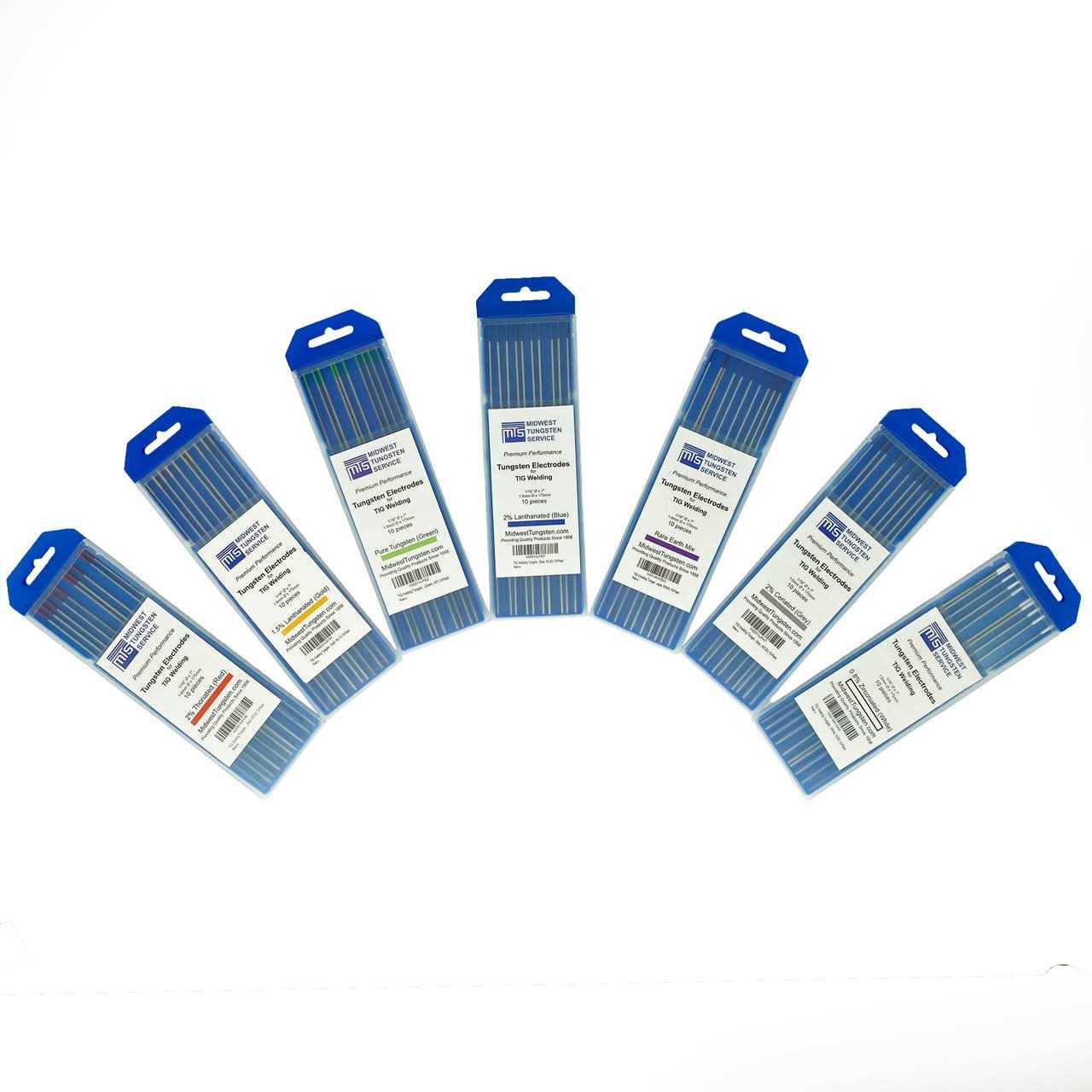 A welder’s best friend, this ten pack of blue 2% lanthanated 3/32 inch x 7 inch TIG welding tungsten electrodes will help you get the job done. Engineered to exact specifications, you can count on these long-lasting electrodes to perform during your most difficult welding application, time and time again. With reliable arc-striking and a low burn-off rate, these electrodes maintain the highest quality of arc while exceeding to ISO, ANSI, and AWS standards. Lanthanated electrodes are popular due to the relative ease of striking an arc and lower amperage required. They perform exceptionally well in both AC & DC applications. Sixty years of experience have culminated into these premium quality TIG welding tungsten electrodes, and you can benefit from that experience. Midwest Tungsten Service is an ISO certified manufacturer.