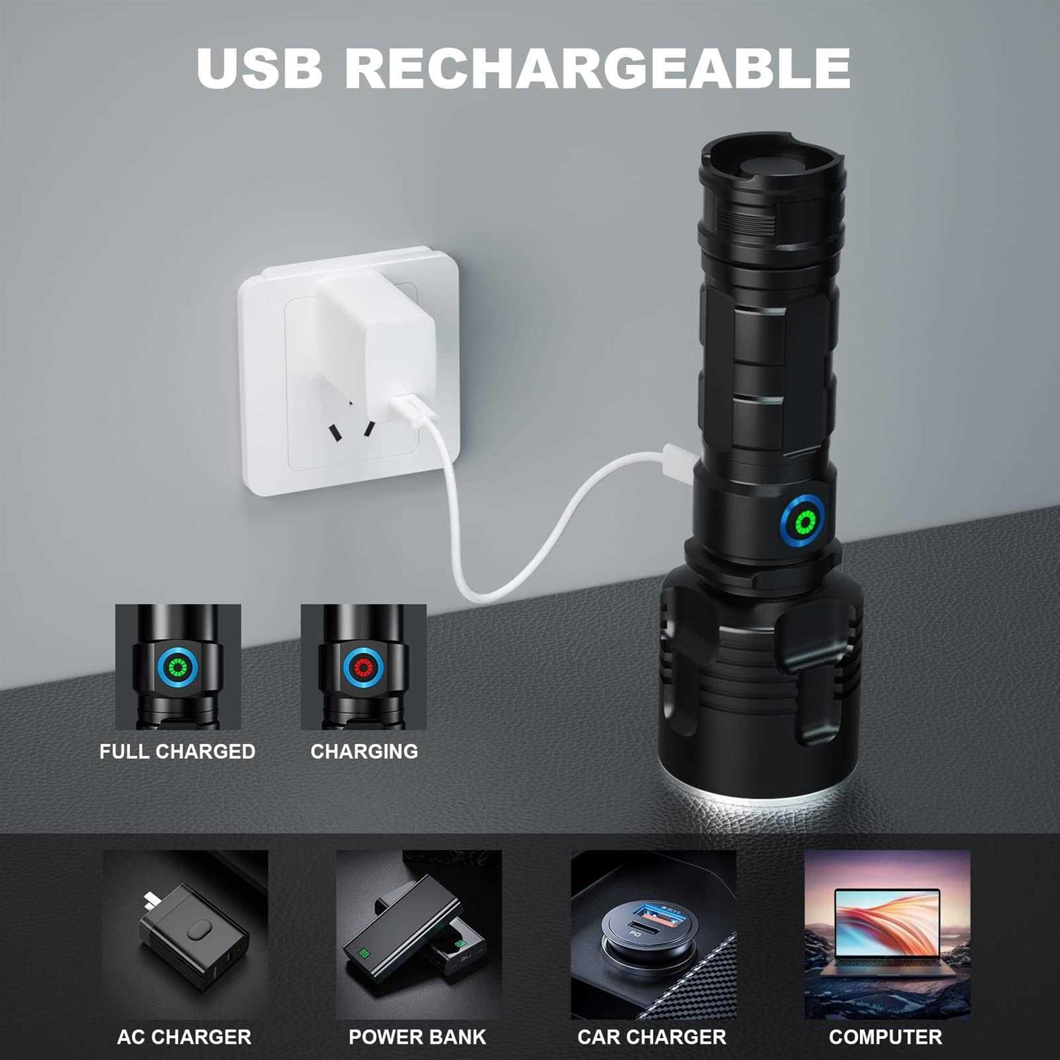Super Bright The brightest flashlights adopts xhp70 led bulb. It can continuously output 900,000 high lumens brightness, and the irradiation range is up to 500 meters. This LED flash light can not only meet your daily lighting needs, but also can be used for outdoor mountaineering, camping, fishing at night. Rechargeable Flashlights For a flashlight, in addition to brightness, the most important thing is service life. Our torch flashlight is equipped with a USB charging port, which can be charged at any time. And it not only supports charging at home, but also can be charged with a power bank in an outdoor emergency. You don’t have to worry about the flashlight running out of power at any time. 8-12 Hours Long Standby Time When you use our rechargeable flashlights, you don’t have to worry about running out of power quickly. Low Power Reminder The switch of the flashlight has two color prompts, when the bright flashlight is working, the button light is green, and when the power is lower than 25%, the light will turn red reminding you that it should be charged. This allows you to recharge the flashlight in time to avoid running out of power in an emergency. Warm reminder, it is best to charge in time when the power is higher than 25%, so as to prolong the service life of the flashlight. 3 Light Modes The LED flashlight has 3 light modes to meet your different needs. They are high brightness, low brightness and strobe mode. High brightness can be used for outdoor camping, low brightness can be used when walking the dog, and the stobe mode can be used as a warning when encountering vehicles at night, or to scare wild animals away when you are camping outdoors. The flashlight is zoomable and can be adjusted freely according to your needs.. MILAOSHU rechargeable flashlights adopts XHP70D bulb, the maximum brightness can reach 900,000 lumens, the LED flashlight is made of high-grade aluminum alloy, and the waterproof level is IPX5, which is very suitable for outdoor use. In order to meet different usage needs, the flashlight has three light modes, high brightness, low brightness and strobe mode. The bright flashlight can achieve 8-12 hours of long standby time without you needing to recharge frequently. The button is green when the flash light is fully charged, and the button is also green when working. When the power is lower than 25%, the button turns red, reminding you to charge in time for emergencies. Our flashlight is very suitable for outdoor use, one of the indispensable tools for camping, night running, climbing, fishing.