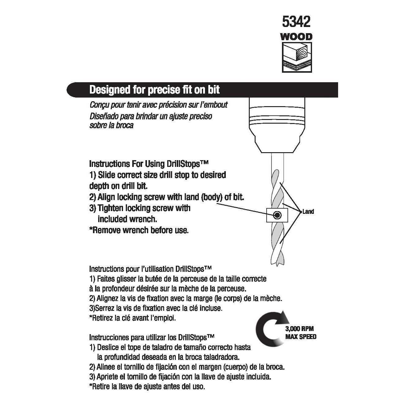 • Six collar stops for use on 3/16″, 1/4″, 5/16″, 3/8″, 7/16″, and 1/2″ diameter drill bits