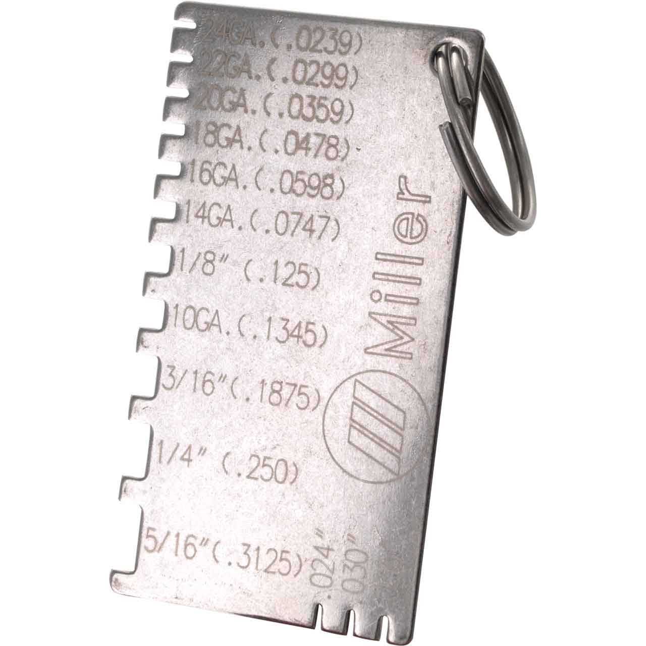 Thickness by Miller. Details:Determine your material and wire thickness with the miller wire/metal size gauge. Determine the thickness of the material. Quick accessibly key chain holder attached. Not just for welders, may applications.