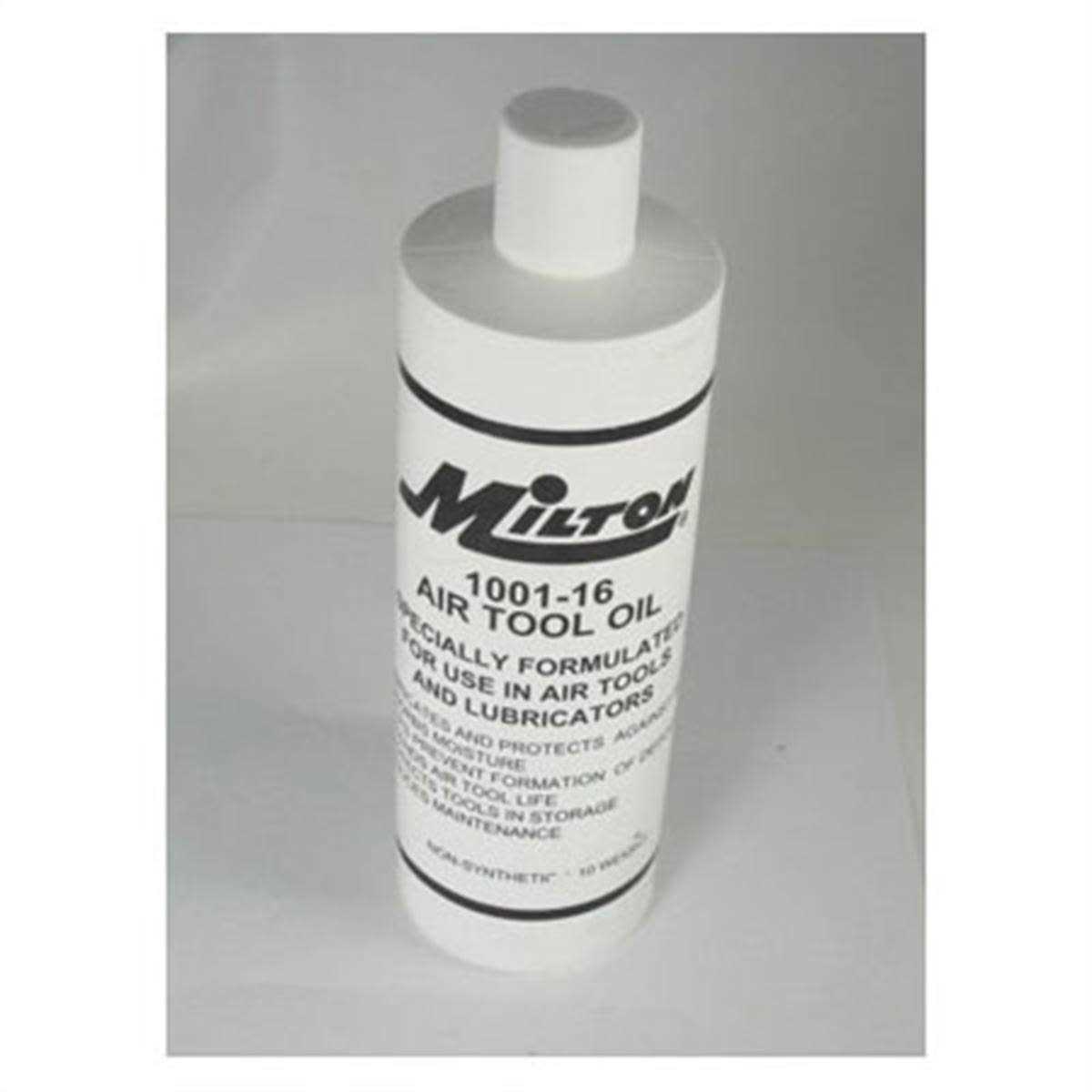 Improve performance and extend tool life with the High-Performance Conventional Pneumatic Tool Oil from Milton. Since proper lubrication is essential to keep pneumatic tools in peak condition, Milton’s air tool oil was created to extend the life and performance of air tools, lubricators, valves, and cylinders. Not only does our Air Tool Oil restore your tools to running like new, but it can also prevent the seizure of tools and pneumatic equipment during the moments you need them the most. Milton’s formula absorbs moisture, protects against rust, and even helps prevent formation of deposits. This non-synthetic, ISO 32 grade 10 weight oil is recommended for tools requiring a lubricant. Available in 4-sizes: 1 Gal., 32 oz., 16 oz., and 4 oz. Features: Specially formulated for use in air tools and lubricators. Lubricates and protects air tools, improves performance, and extends tool life. Reduces corrosion and rust, prevents formation of sludge deposits. Non-synthetic, anti-foaming formula, Works in temperatures down to minus 25°F (minus 32°C).