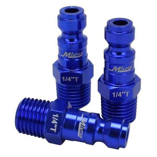MILTON 5 Piece T Style Air coupler and plug fittings ColorFit set customized a color code system that allows for easy matching of couplers and plugs among the standard Industrial pneumatic air coupler quick connects. Great way to solve that annoying problem of potential crossing contaminating different air lines. By dedicating certain colors to different air lines, this will eliminate the risk of mixing a lubricated line with a dry air line which will help prolong your applications and quickly finishing any project. Each piece coated with Anodized Blue aluminum and heavy duty steel sleeves to prevent scratches or dulling of the coupler and plug after uses.