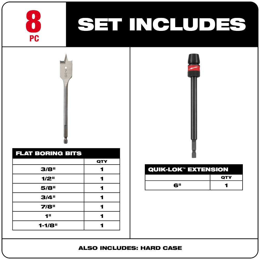 The Milwaukee flat boring bit set is designed to use for drilling clean holes at any angle in a variety of surfaces. Double wing spurs offer smooth hole formation while minimizing vibration and preventing breaking out. Cutting edge technology initiates quick wood boring and better chip removal thus allowing heat from dissipating. Quick-lok mechanism enables quick and easy accessory changes in confined spaces.The 1/4 Inch quick-change hex shank conforms well with all Quik-Lok extension. Set contains 3/8 Inch, 1/2 Inch, 5/8 Inch, 3/4 Inch, 7/8 Inch and 1-1/2 Inch bits.