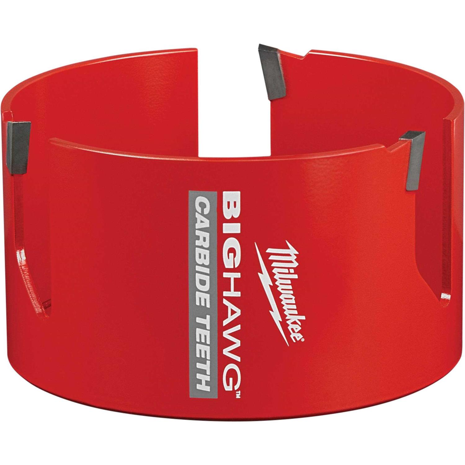 Milwaukee Big Hawg with carbide teeth is the best hole saw solution for nail-embedded wood and abrasive material applications. Our first-to-market hole saw offers extreme life utilizing advanced carbide technology. The Big Hawg gives users 50X more life in demanding applications with the ability to cut 1000 plus more nails. The heavy-duty hole saw has 10X larger carbide teeth that rip through materials 5X faster. Deeper slots allow for fast and easy plug removal. Our Big Hawg hole saw is the best solution for cutting through the toughest materials, including nails, cement board, shingles, plaster and stucco.