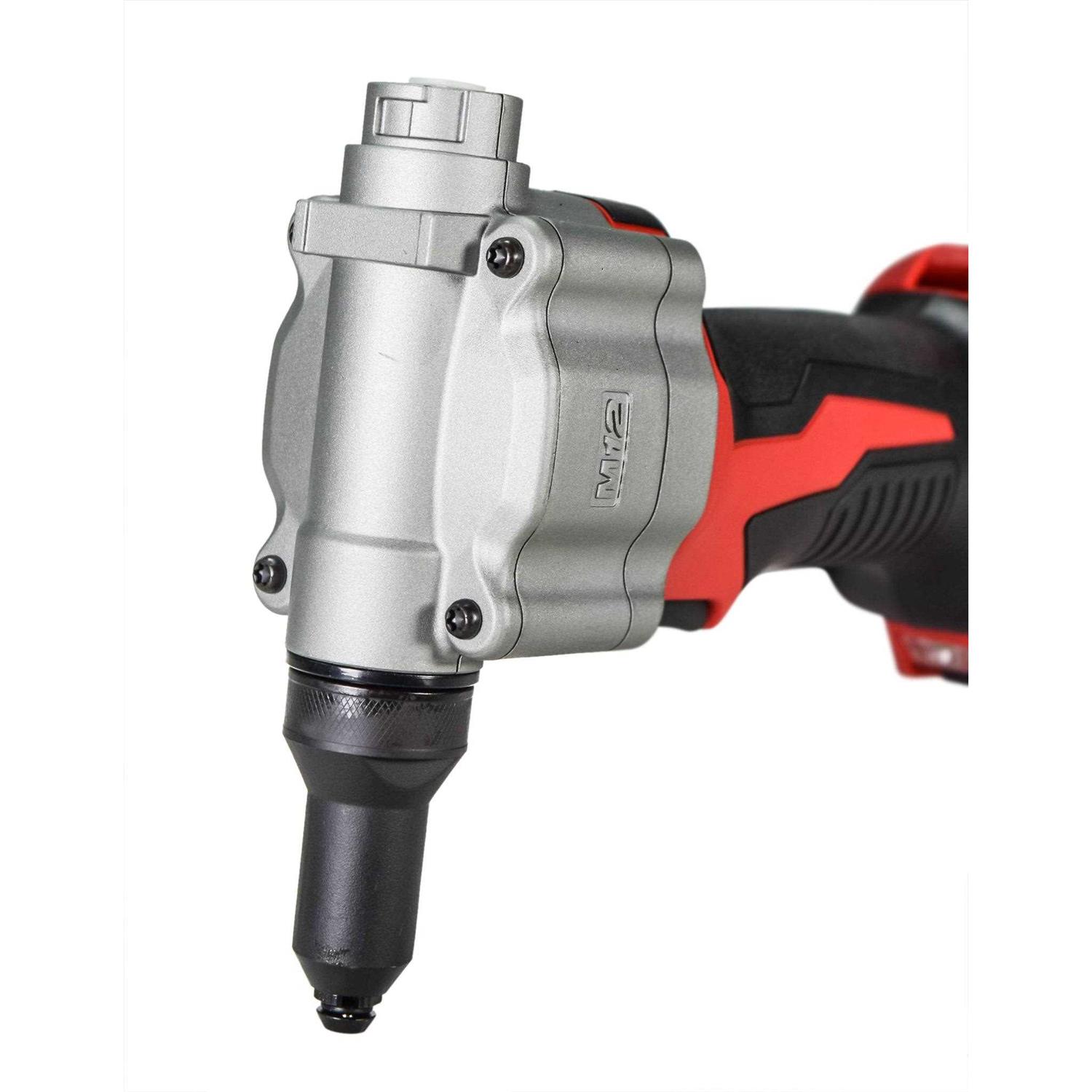 The M12 rivet tool is the first cordless solution that delivers fast, easy riveting while maintaining performance, durability, and size. The 2550-20 can pull up to 3/16 in. stainless steel rivets, 450 pcs. of 1/8 in. steel rivets on one 1.5 amp hour charge, and reduces muscle effort from a hand tool by over 60%. No compressors or hoses during set up and operation makes this tool a great replacement to pneumatic products. 2X longer life over current cordless solutions delivers greater durability from common jobsite conditions and use. This is the most compact cordless rivet tool on the market, measuring only 6.5 in. in length allowing users more access in tight spaces. The M12 rivet tool is part of the M12 battery platform, offering 90+ solutions on one battery system.