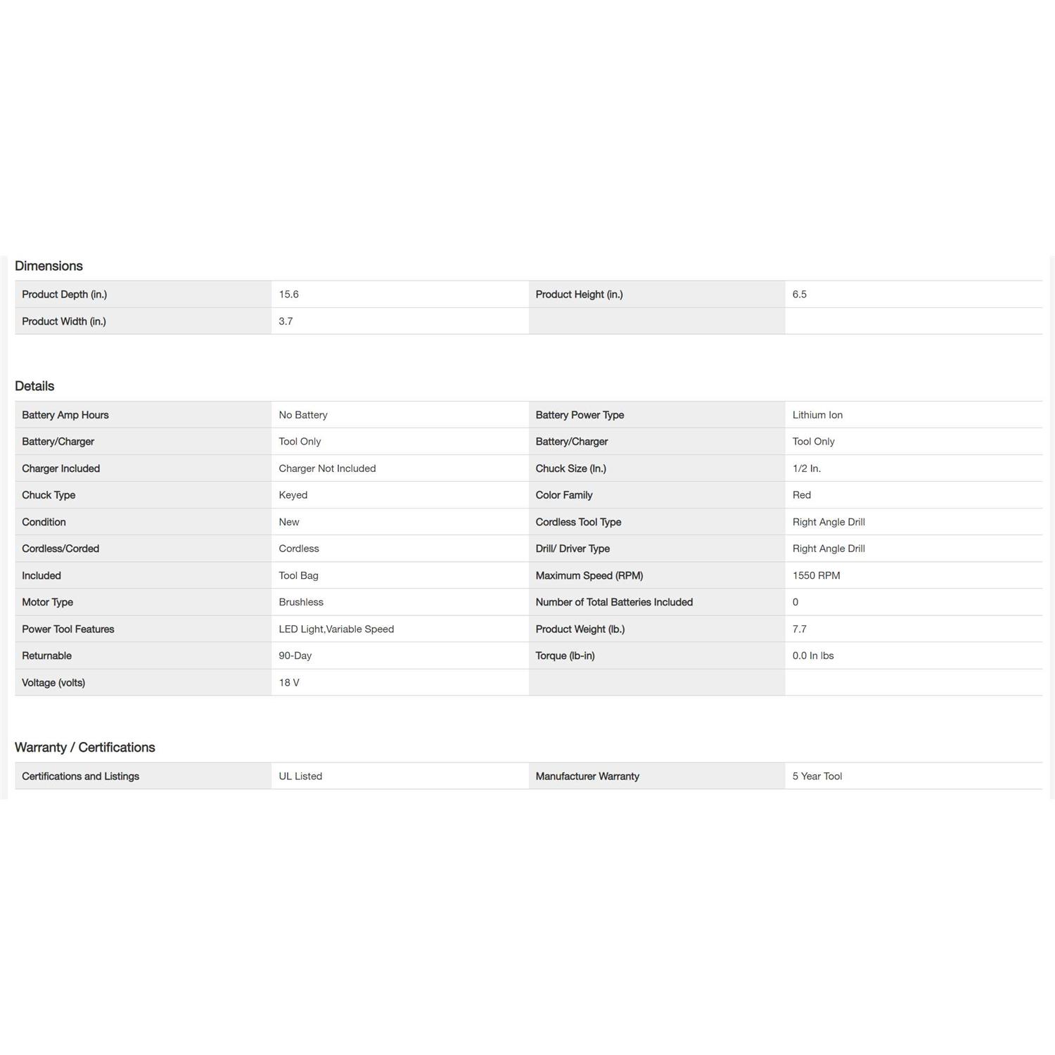 Milwaukee Tool 2807-20 M18 Fuel Hole Hawg 1/2 in. Right Angle Drill