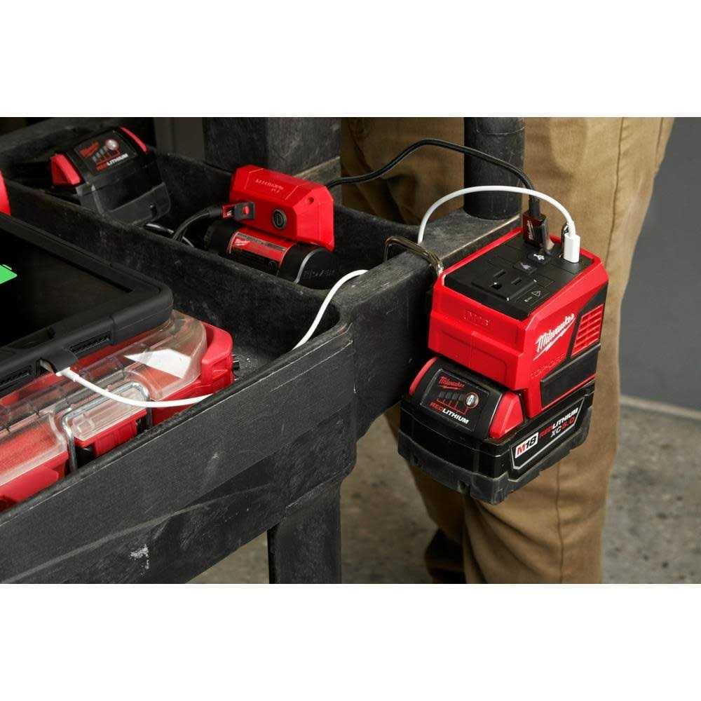 The M18 TOP-OFF 175W Power Supply delivers faster simultaneous power to personal devices and small electronics. Attach any M18 battery to provide continuous power or recharge devices with (1) AC 120V outlet, (1) USB-C PD port, and (1) USB-A port. You can quickly charge up to three devices at the same time, without the barriers of speed throttling. With the USB-C PD port (45W), this battery inverter is capable of recharging devices, from a fully depleted state to 80% capacity, up to 75% faster than conventional wall chargers (5W). The MILWAUKEE compact portable power supply has an attached metal rafter hook that can be extended to hang it from carts, lumber, or other jobsite materials when worksurface space is limited. You can instantly set up a mobile workstation or keep electronics securely within eyeshot, rather than making frequent trips to a wall outlet.