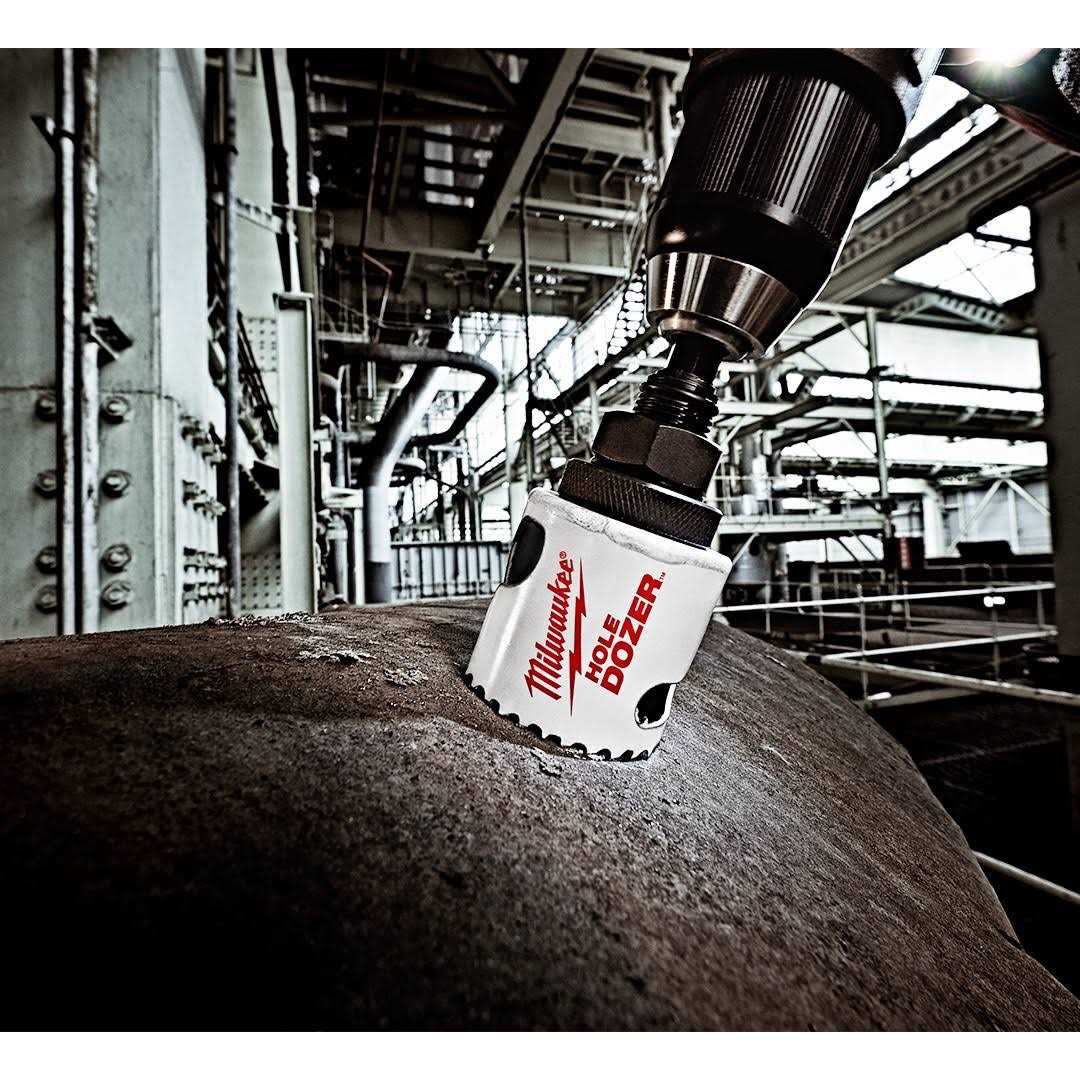 The 49-56-9100 features a 7/16 in. hex shank, which can be used with any 7/16 in. extension. The 49-56-9100 also features a drive plate which is tightened up to the hole saw to eliminate wobble between the Arbor and hole saw.