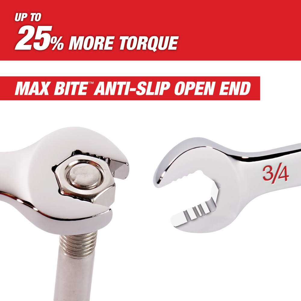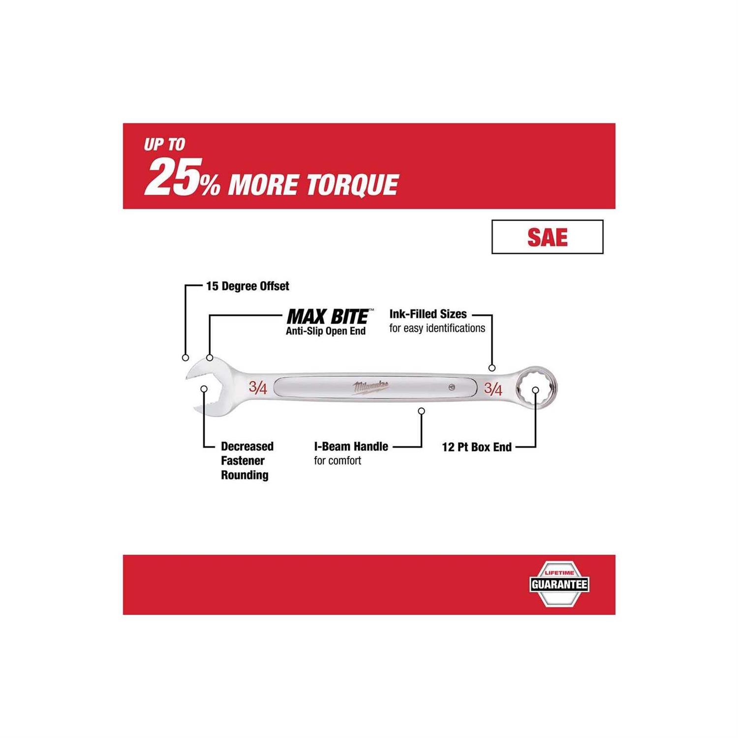 The MILWAUKEE SAE Combination Wrenches provide you with 25% more torque than smooth-faced wrenches with our innovative MAXBITE Open-End Grip. In addition to increased torque, MAXBITE also reduces the rounding and stripping of nuts and bolts. The ergonomic wrench features an I-Beam handle for optimized comfort and durability. Ink-filled size labels allow for easy size identification and quick distinction between SAE and metric sets. The MILWAUKEE SAE wrench sizes range from 1/4in to 1-1/2in and feature a Lifetime Guarantee.