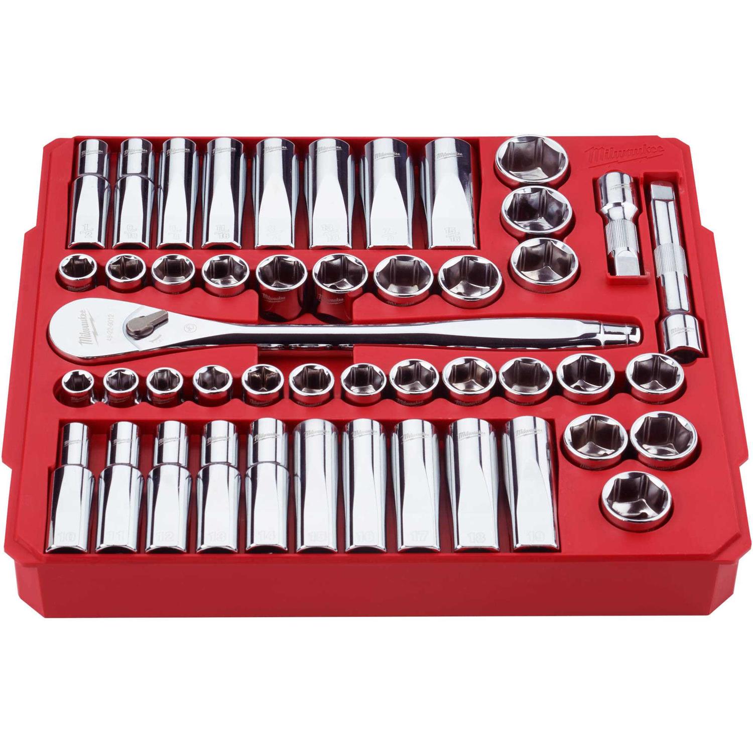 Drive Ratchet and Socket Set offers better access in tight spaces and maximum tool strength. The 90-tooth ratchet tool offers 4of arc swing and a slim profile design, so users can work in tighter spaces. The Milwaukee socket set features an innovative wrench-compatible socket design with 4 flat sides to help prevent rolling. The 1/2 in. drive ratchet has sockets with sizes laser engraved into the flats for easy-to-read visibility. The optimized socket geometry additionally helps reduce bolt rounding and stripping. The Milwaukee ratchet and socket set includes a removable inner designed to be stored long-term in a steel storage chest and a durable carrying case for ultimate portability. The sets accessories guarantee users have what they need to tackle every job, both in the garage and on the jobsite. Drive Ratchet and Socket Set is backed by a lifetime guarantee.