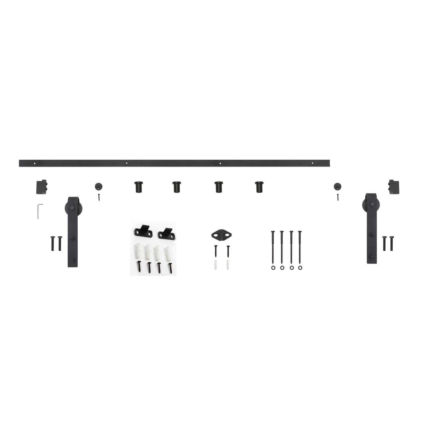 Miseno MBDH0005X60 60″ Bent Strap Barn Door Hardware Kit Features:For doors up to 30″ wide – Steel construction for long lasting durability – Includes all necessary mounting hardware for easy installation – Meets ANSI/BHMA A156.14-2013 Grade1 220lb (100KG) durability test – POM wheel – 2-3/4″ diameter – Steel 1-1/4″ diameter roller bearings – Kit Includes:Rail spacer (4)Rail mount lag bolts (4)Rail mount washer M8 (4)Bent strap hangers (2)Hanger bolts for 1-3/8″ door – Hanger bolts for 1-3/4″ door – Hanger bolt washers M10 (8)Hanger bolt cap nuts M10 (4)Mortised door guide (1) with screws (2) anchors (2)Non-mortised door guide (2) with screws (4) anchors (4)Anti jump disk with screws (2)Rail door stops standard (2)Allen wrench M2 for door stops (1)Specifications:Track Size: 1/4” steel, 1-1/2” x 60”Strap Size: 1/4” steel, 11-1/2” x 1-1/2” Track and Hardware Kits Black