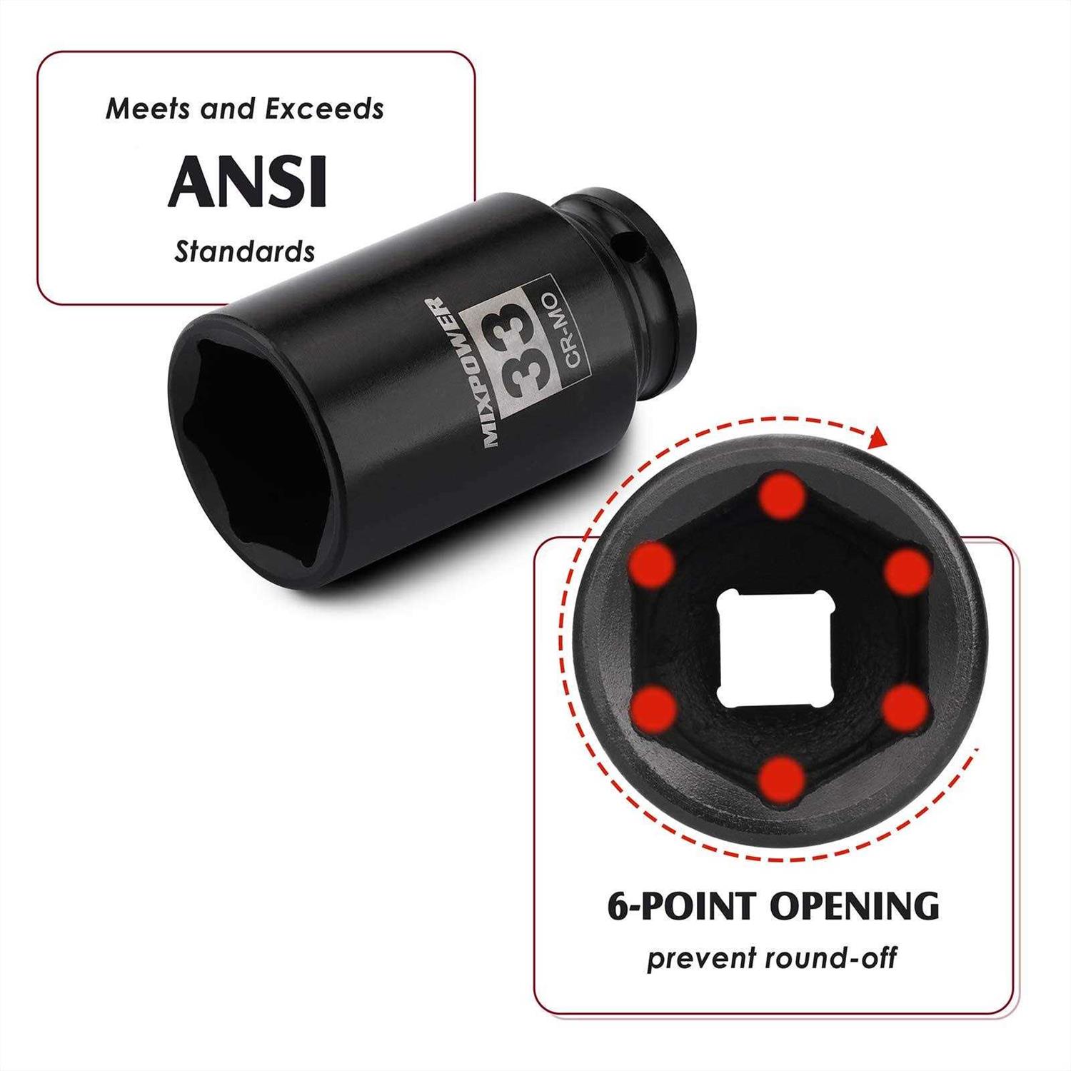 MIXPOWER 1/2″ Drive Deep Impact Socket, Cr-Mo, 33 mm, Metric, 6 Point, Axle Nut Impact Grade Socket for Easy Removal Mt025