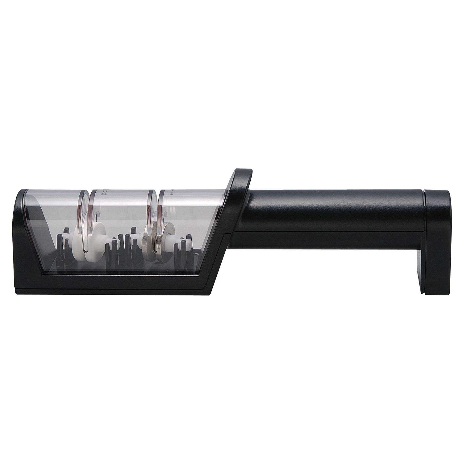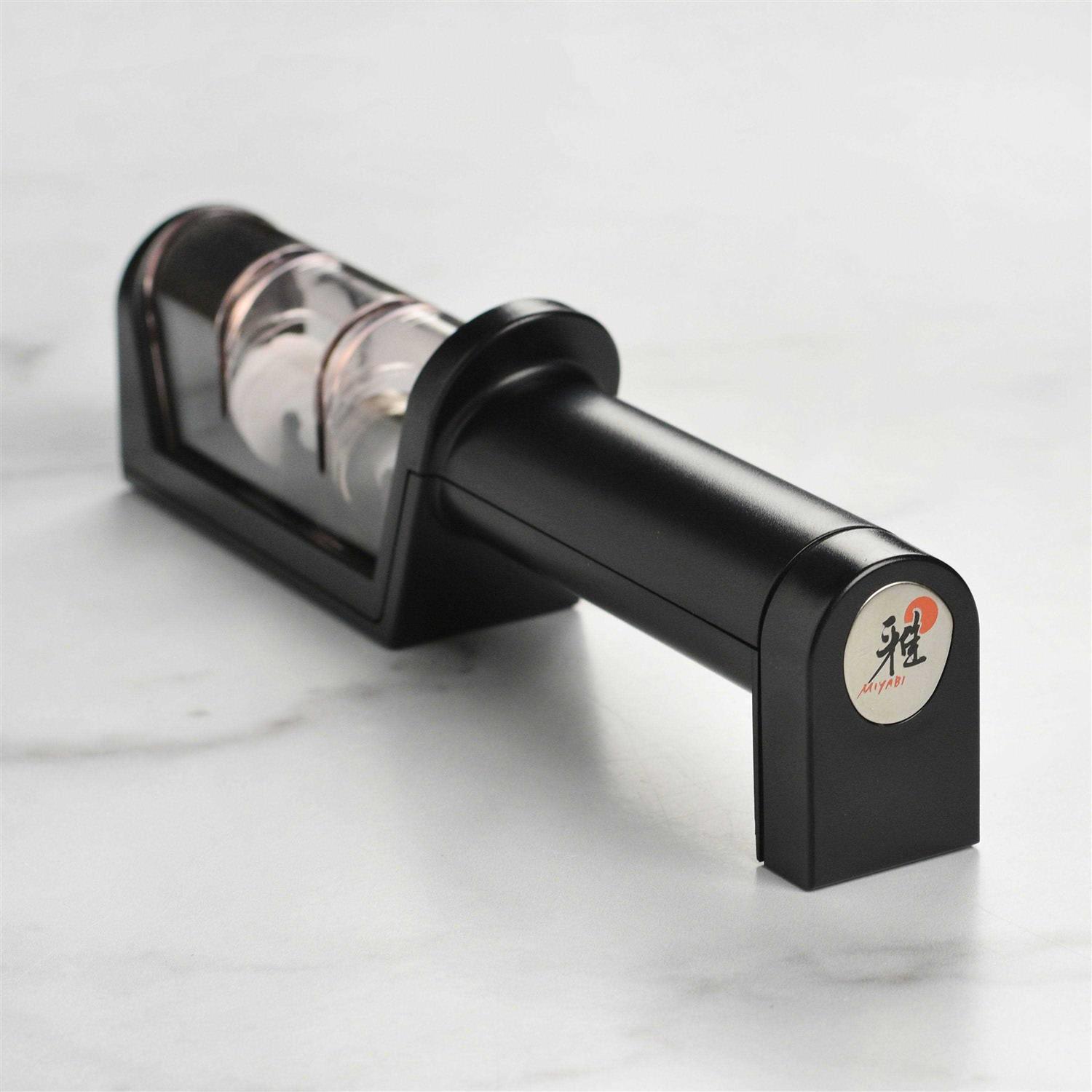 With the Miyabi knife sharpener with ceramic rollers, your knives can be sharpened more smoothly and in greater comfort. The sharpener features a pre-set sharpening angle so that your knife is always in the right position. The blade is first pulled through the diamond-coated roller several times to achieve a beautiful cutting edge. The knife is then pulled through the ceramic rollers several times at the end of the sharpening process. This makes the knife exceptionally sharp so that it can effortlessly cut through meat, fish and other foods. Silicone grippers help the knife sharpener stay stable as you work so that it doesn’t slip. The ergonomic handle is made from easy-care plastic and can be comfortably held by both left-handed and right-handed chefs. This knife sharpener can also be used to sharpen non-serrated knives made from different steel types, as well as knives from the Miyabi range. With this Miyabi knife sharpener, sharpening your knives couldn’t be easier.