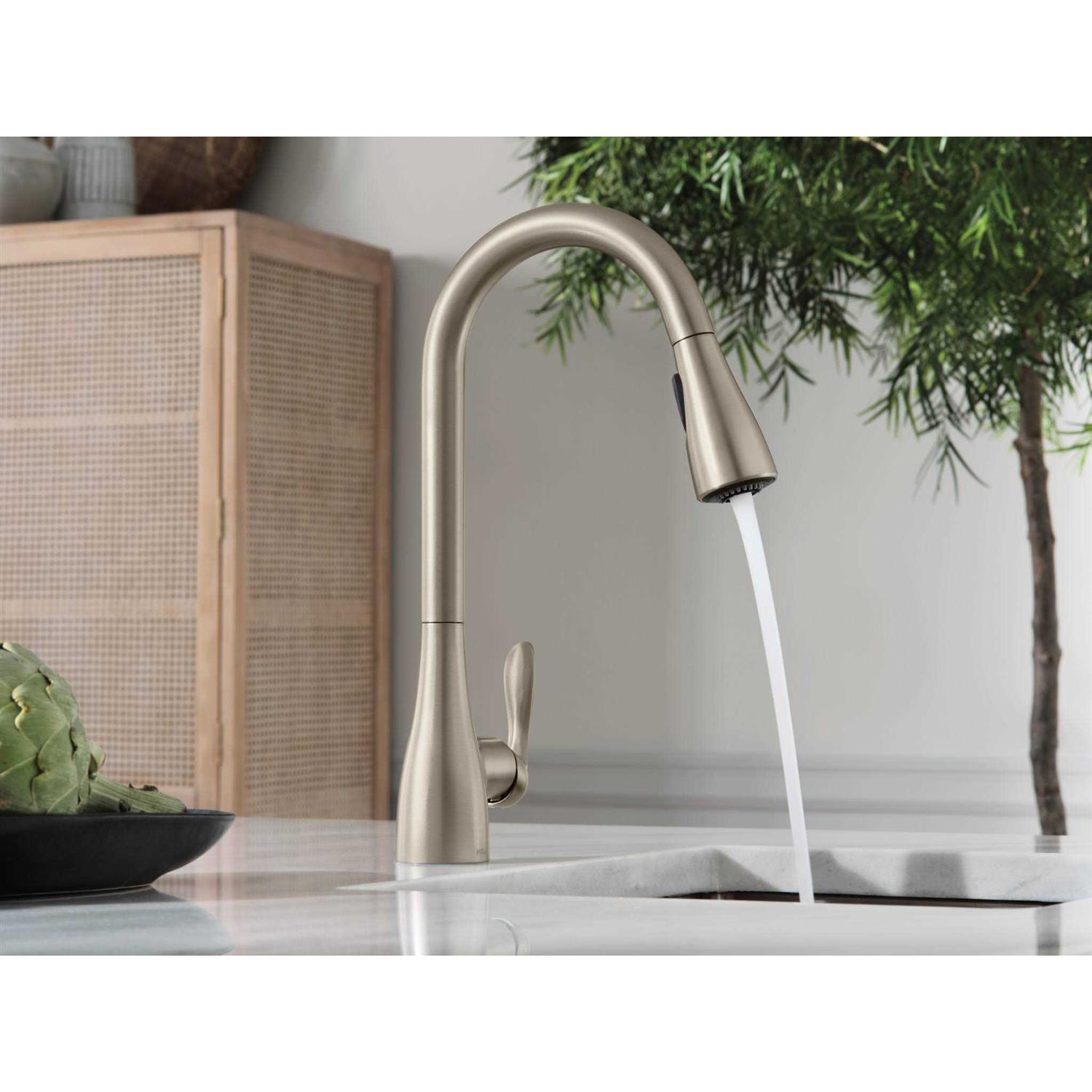 With its smooth curves and sculpted handle, the Moen Georgene pulldown kitchen faucet offers an elegant take on Transitional design. The fixture features Moen/s Power Clean spray technology, which cleans 50 percent faster than Moen faucets without the technology, as well as the Reflex system to ensure smooth operation and secure docking of the spray wand. It mounts with or without a deck plate.