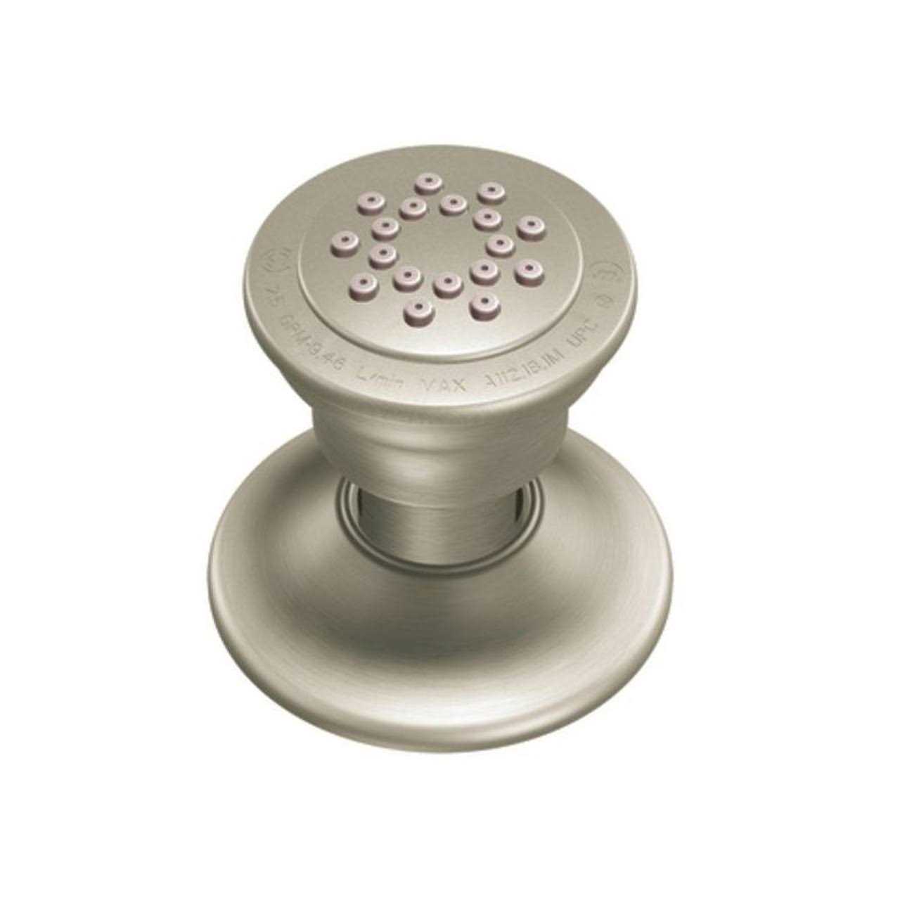 The MOEN Body Sprayer is the perfect way to turn your ordinary shower into a refreshing soothing retreat. A beautiful brushed nickel finish brings the warm look of stainless to your bath as you relax and unwind in the comfort of your own space. This sprayer installs easily with a standard 1/2 in. connection and has a full spray pattern with one setting. Brushed nickel finish provides a lightly brushed warm grey metallic look Metallic spray face and shell with a brass swivel ball assembly Sprayer face diameter: 2 in.