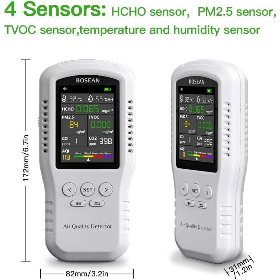 Indoor Air Quality Meters by MOESAPU. Details:Style:Air Quality Monitor CO,CO2, PM2.5, TVOC, HCHO, Temp/Humid (TZ-01) Have you gone nose blind to household odors or dust? Check multiple measures of your home’s air quality. This air quality monitor allows REAL-TIME accurate monitoring of temperature (in C), humidity, formaldehyde (HCHO), total volatile organic compounds (TVOC), and micron-sized fine particulate dust (PM2.5), carbon monoxide(CO), carbon dioxide(CO2). Formaldehyde is an environmental carcinogen yet odorless at lower concentrations. Detect low levels of airborne TVOCs not perceivable to the human nose. Specifications: -3.2“ color 320*240 LCD -DC 5V Type-C USB charging w/ 6 hrs battery life -HCHO: 0-1.999 mg/m3 -TVOC: 0-9.999 mg/m3 -PM2.5: 0-999 μg/m3 -CO:0-2400 ppm -CO2:0-5000ppm -Temperature Test Range: 0~50°C Humidity Test Range: 20~90%RH Tips on Use: 1. Please set the timing function of the device with the guidance of user manual. 2. Please charge the monitor to…