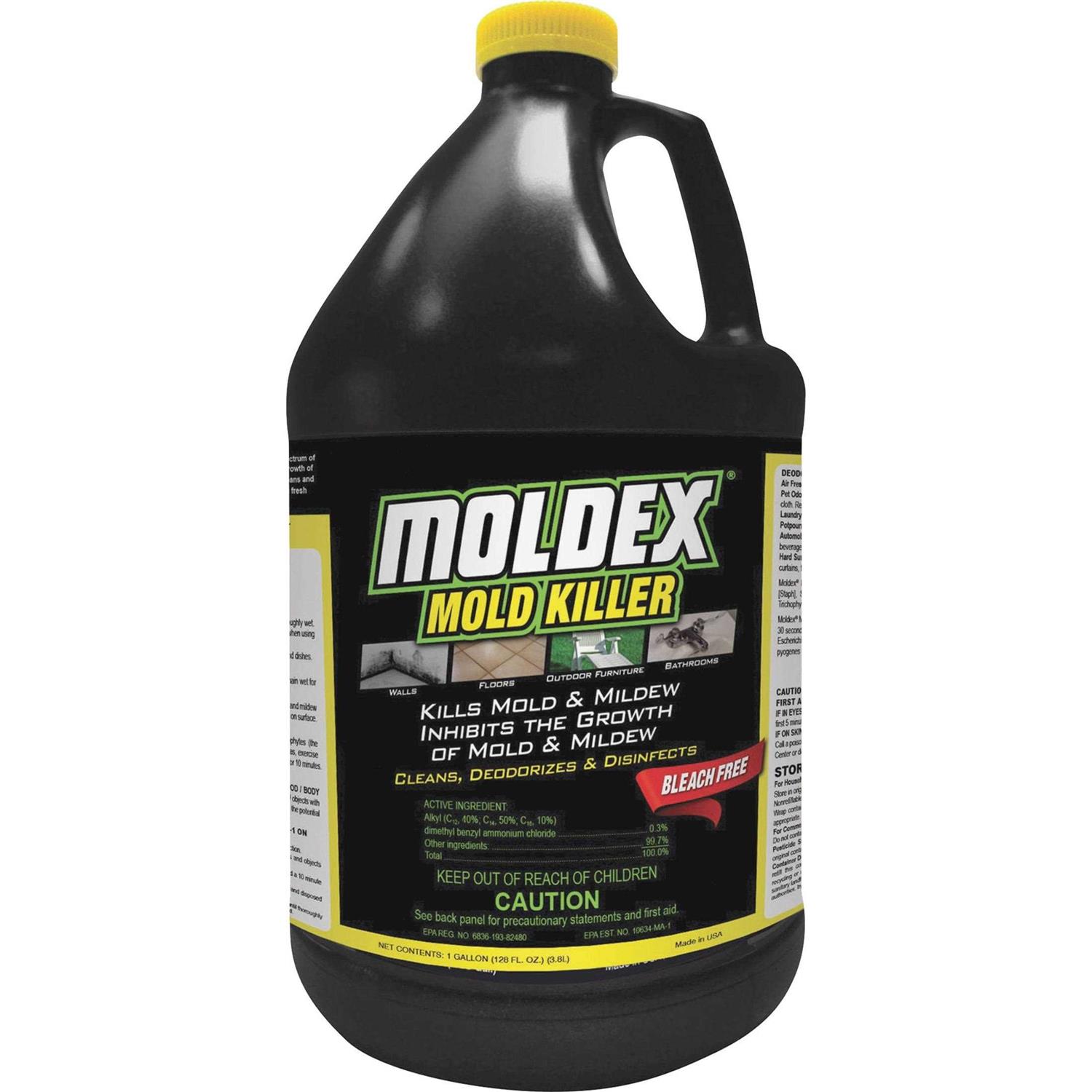 Moldex mold killer is a multi-purpose cleaner, disinfectant and deodorizer. It kills mold, kills odor-causing bacteria. Inhibits the growth of mold and mildew. It is effective against a broad spectrum of bacteria, is fungicidal and inhibits the growth of mildew and their odors when used as directed. It delivers non-acid cleaning performance in an economical ready-to-use package. It is bleach-free and cleans most hard, non-porous, washable household surfaces. When used as directed, Moldex mold killer will clean and deodorize surfaces in rest room and toilet areas, behind and under sinks and counters, garbage cans and garbage storage areas and other places where bacterial growth can cause malodors. Mold killer is a hospital disinfectant, bactericidal according to the current AOAC germicidal spray test method and virucidal according to the virucidal qualification on inanimate surfaces.