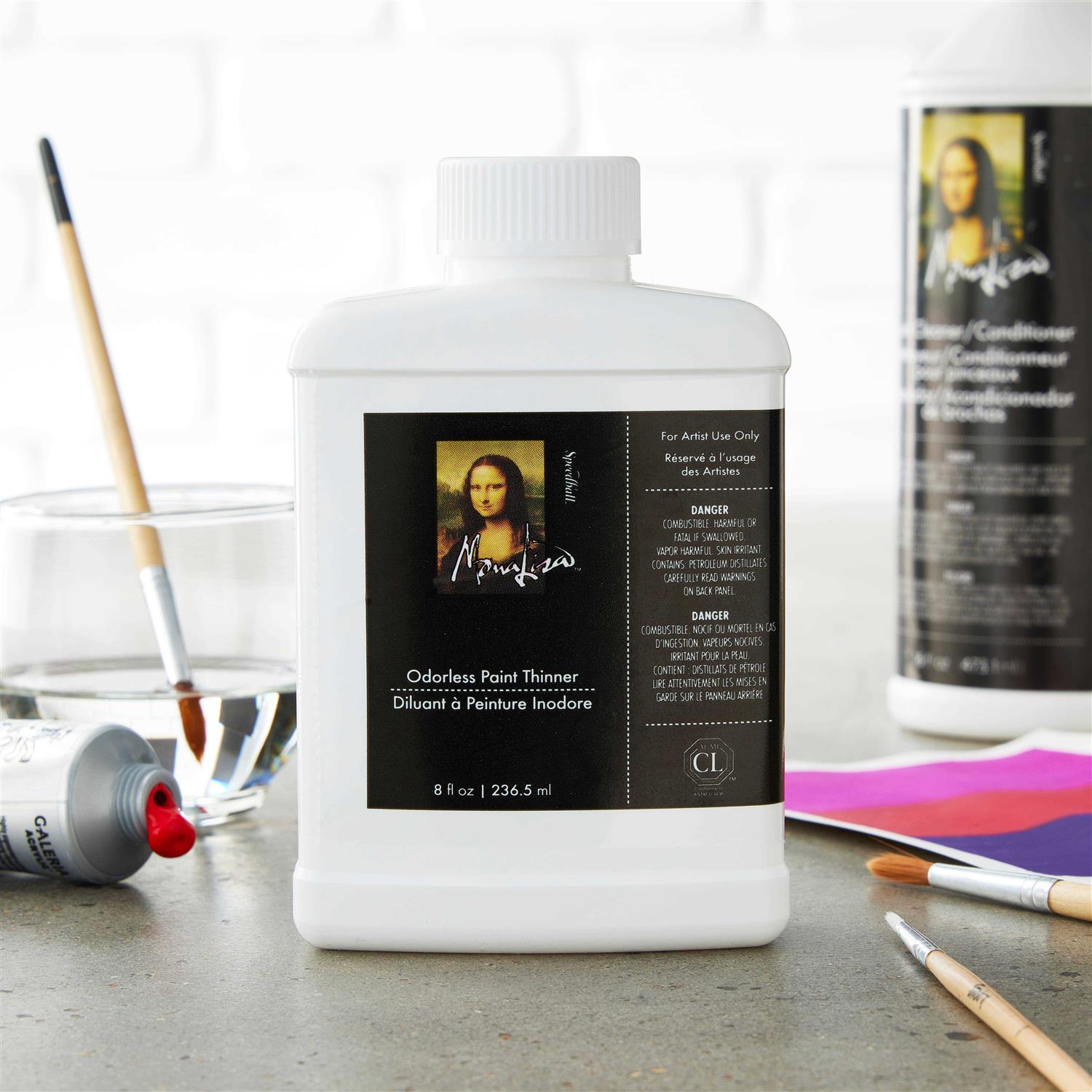 Thinner is used in all types of artist oil, oil Based paints, and varnishes It can be used like turpentine with no unpleasant odor It contains 100 percent odorless mineral spirits Product is combustible and harmful if swallowed Packaged in a Shatterproof 8-ounce bottle with a child Safety locking cap SPEEDBALL-Mona Lisa Odorless Thinner. For use in all types of artist oil, oil based paints, and varnishes. A great brush and accessory cleaner. Can be used like turpentine with no unpleasant odor. Contains 100% Odorless Mineral Spirits. Product is combustible and harmful if swallowed. Packaged in a shatterproof bottle with a child safety locking cap. 8 fluid ounces (237ml). Made in USA.