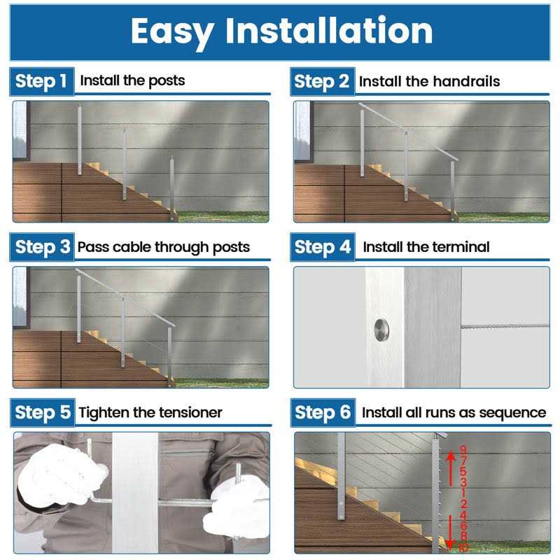 If your project requires additional products, pls search Muzata and the model number to find products More options – This 6.5ft burshed stairway cable railing system can be cut to any lengths less than 6.5ft on stair sections. Search Muzata RC01 to find 36″ surface mount horizontal system at 6.5ft, 13ft and 19.5ft. However, please note that this brushed system RC03 is not suitable for projects within 10 miles of the seaside or saltwater Beginner friendly – The package includes all the products you need for cable railing system installation, so you don’t have to select and combine them by yourself.