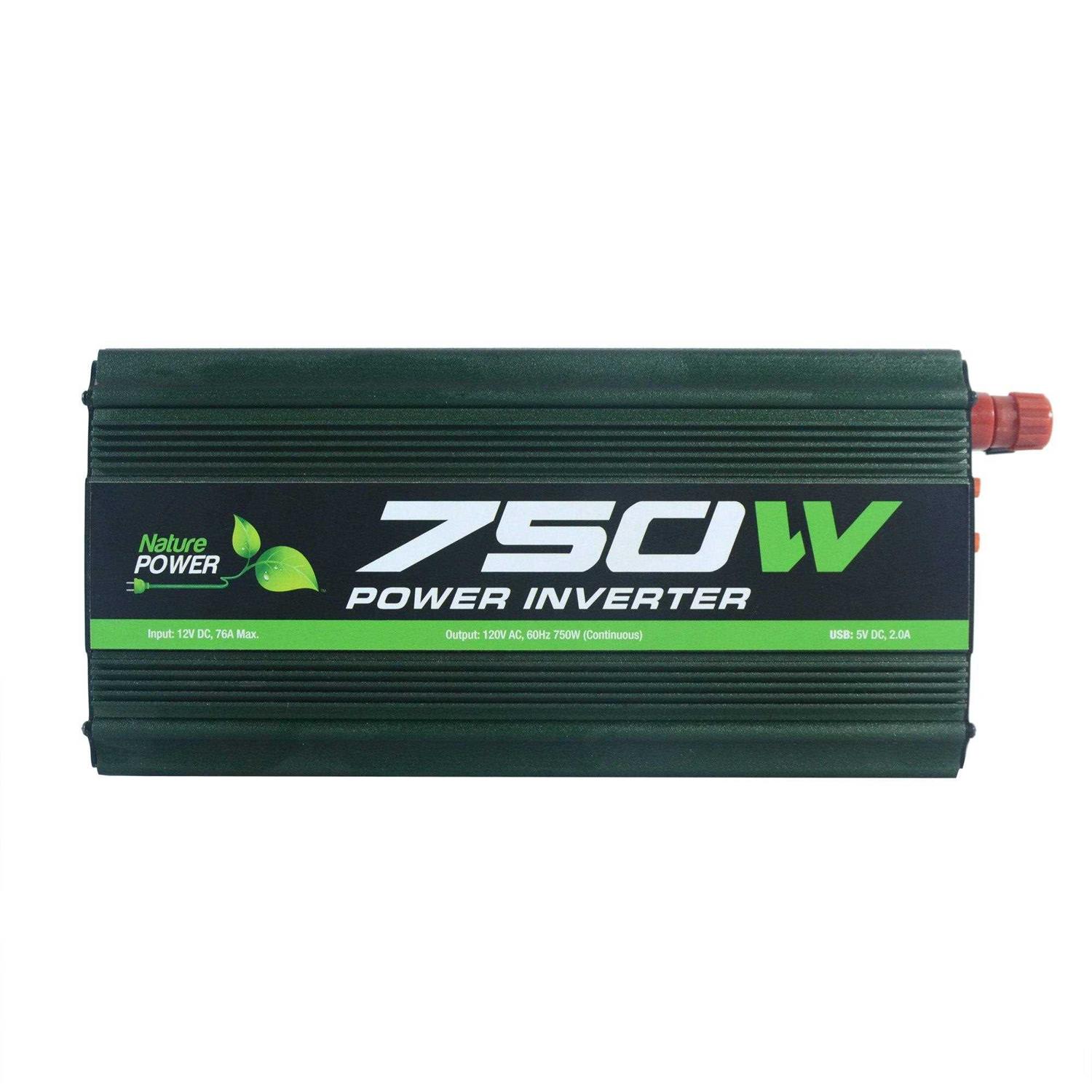 The Nature Power 750-Watt modified Sine Wave Inverter is perfect for recharging devices on the go and for people with mobile lifestyles. Convert battery power to AC Power. This offers 750-Watt continuous power and 1500-Watt peak surge power. Designed to be efficient the modified sine technology is especially designed to increase the efficiency and running time of portable devices and small appliances. Compact portable and great for running laptops small televisions small refrigerator window fan and more.