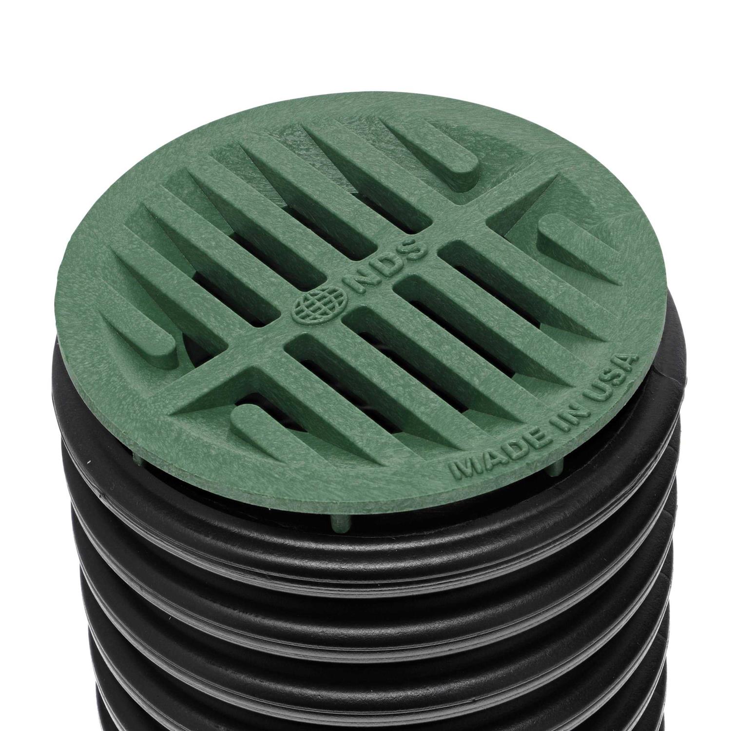 Drain water efficiently away while blocking out harmful leaves and debris before they can enter and clog your pipeline. The 4 inch Round Drain Grate fits on top of drain pipe to drain light flows of stormwater from small lawns, landscaped areas, patios, and walkways. The 4 inch Round Drain Grate, also known as a drain cover, has an open surface area of 2.4 sq. inch and a flow rate of 7 GPM. Connects to 3 inch and 4 inch sewer and drain pipes and fittings, 3 inch and 4 inch single-wall corrugated pipes, and 3 inch and 4 inch triple-wall pipes for a soil-tight fit. The pipe grate is ADA Compliant and heel-proof. Built to stand up to the elements, it’s made of polyethylene, a type of plastic, using a combination of virgin and recycled content treated with UV inhibitors to prevent fading and cracking from the sun. As part of a complete drainage system, the grate blocks leaves and debris as it drains water entering drain pipes. The pipes carry the water to a discharge point downstream such as a pop-up emitter, or to percolate into the ground with a dry well or infiltration trench. NDS offers free tools such as the Home Drainage Center, Calculators, and NDS Stormwater Drainage mobile app to help make your project a success. Founded in 1972, NDS is the preferred choice of professionals and the leader in stormwater management solutions.