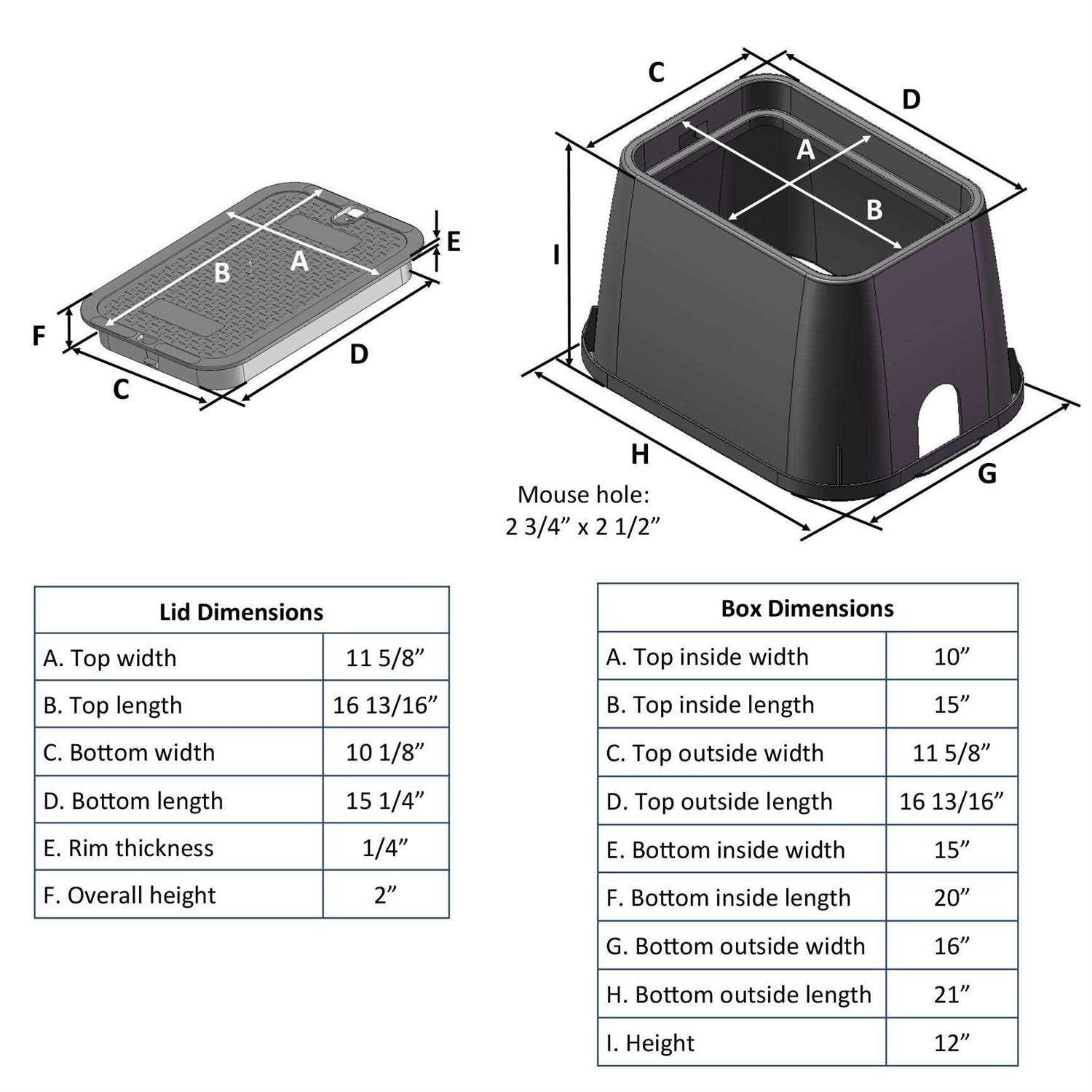 Referred to as 14 x 19 by National Diversified, the actual size of the structural foam polyethylene valve box and cover with locking latch is 12 In. x 17 In. Features an overlapping lip cover, and ultra violet inhibitor. The body is tapered – the bottom is larger to keep it from pushing up once buried. Black body with green cover. Dimensions:12 In. W. x 17 In. L. x 12 In. H, Shape:Rectangular, Color:Black & Green, Material:Box is polypropylene, cover is HDPE