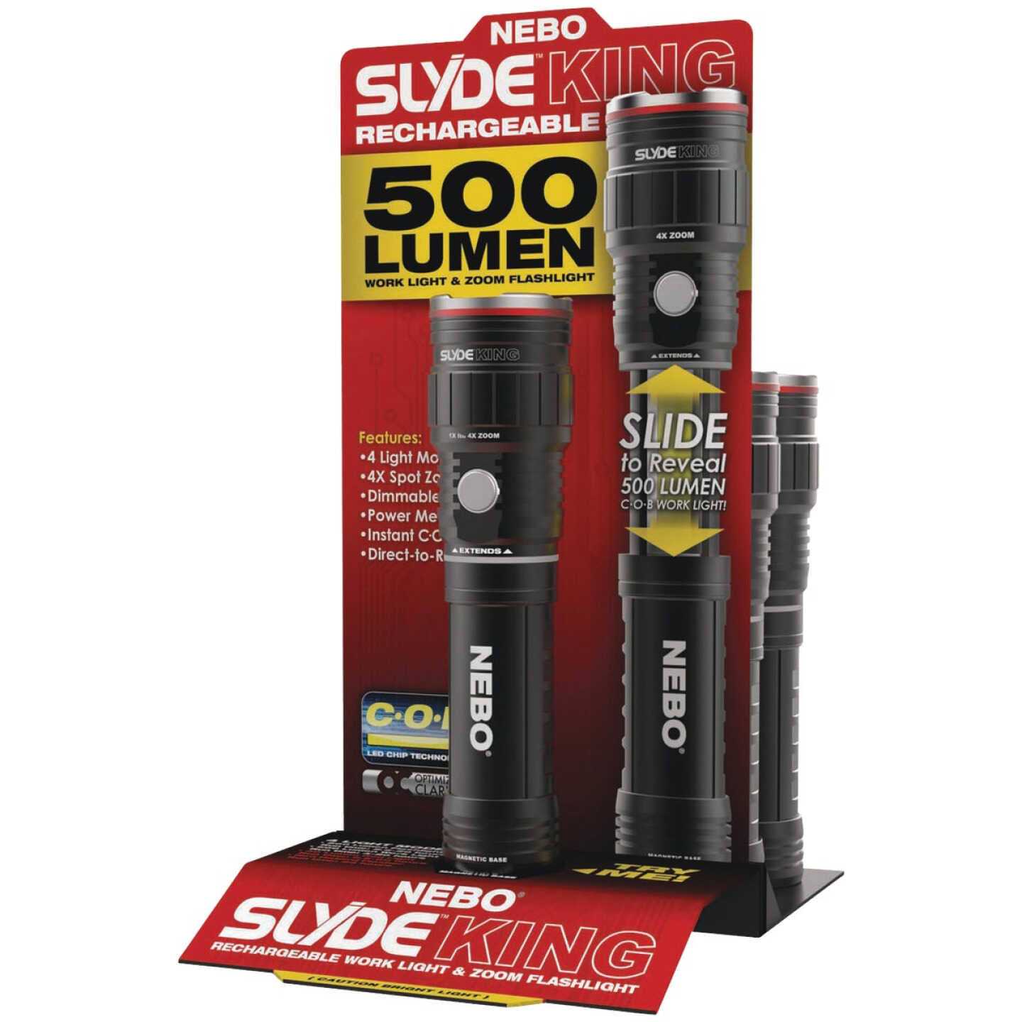 This 2nd Generation Slyde King from Nebo is equipped with programmable memory settings for each light mode, 500 lumen COB work light and LED flashlight, 40 lumens red light, and red flasher. The rechargeable led flashlight is easy to use- twist the Slyde King to illuminate the flashlight. The impact and water-resistant Slyde King flashlight is enclosed in anodized aircraft-grade aluminum. Use the Nebo Slyde King as an LED flashlight outdoors or work light for tasks involving precision; it illuminates with 4X zoom to give a clear vision.
