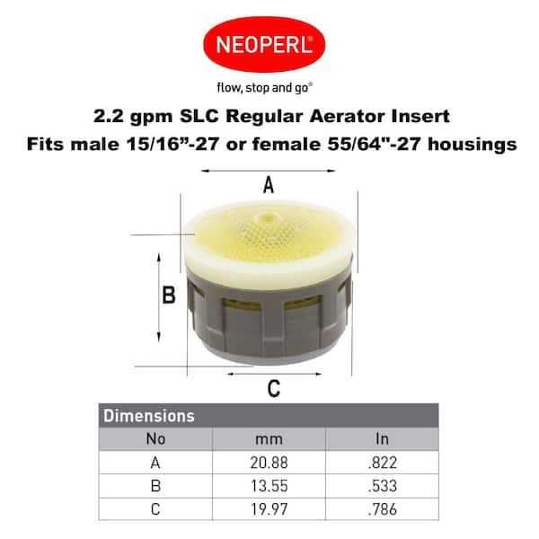 This 2.2 GPM Faucet Aerator SLC Insert by NEOPERL creates a standard water flow of 2.2 GPM. It also features a soft silicone tip to easily rub away lime buildup and has a soft, aerated water stream. Use it when you need to replace the insert only in your original faucet housing.
