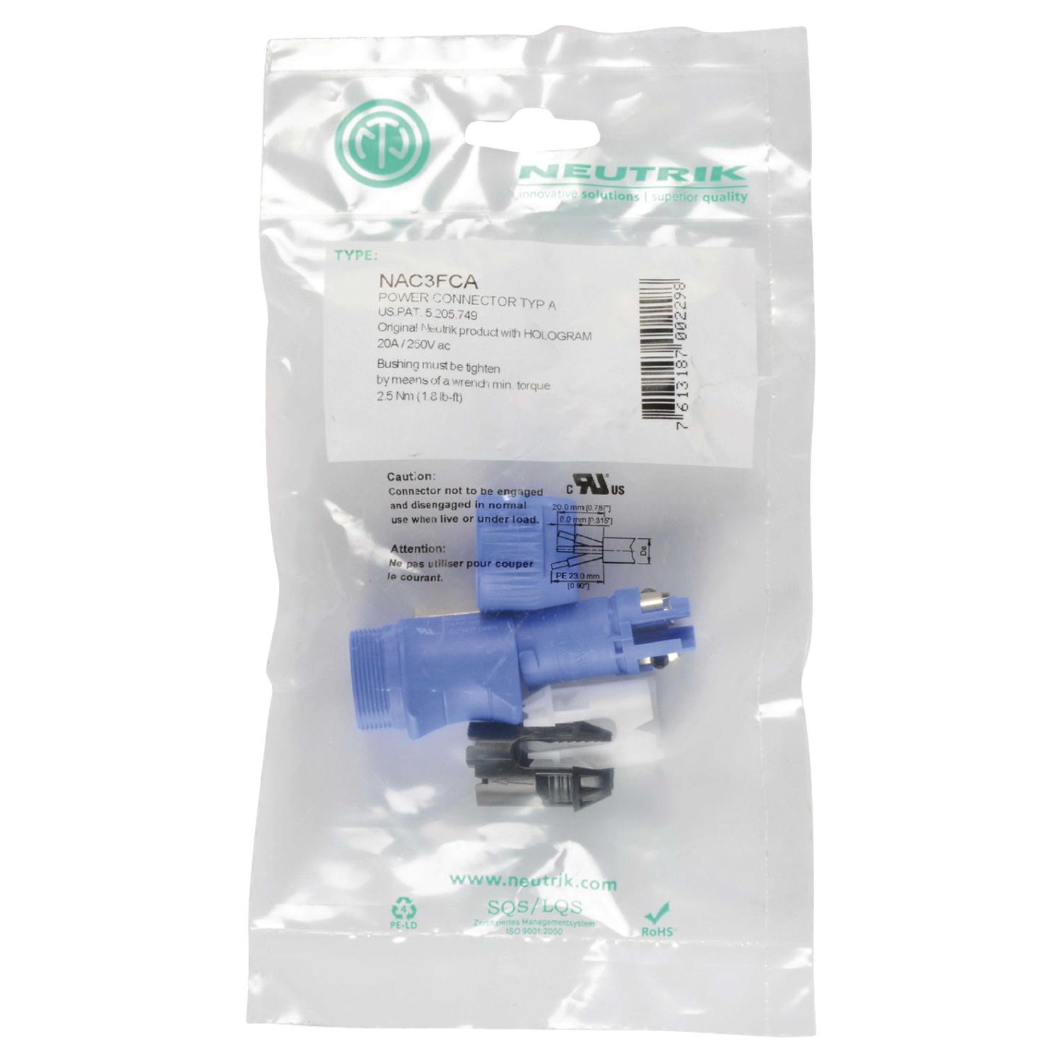 The Neutrik Powercon series of connectors provide a compact yet rugged solution for power connections. A uniquely keyed insert prevents then being used in wrong sockets and a twist-lock system keeps them in place in use. These are increasingly used in professional sound and lighting applications. The connectors are rated to 20A and are available in blue bodies, denoting a power inlet, and grey bodies, denoting a power outlet (or through) connection. These connections are not suitable for situations where disconnection under load would occur. For this, the Powercon True-1 system should be used.