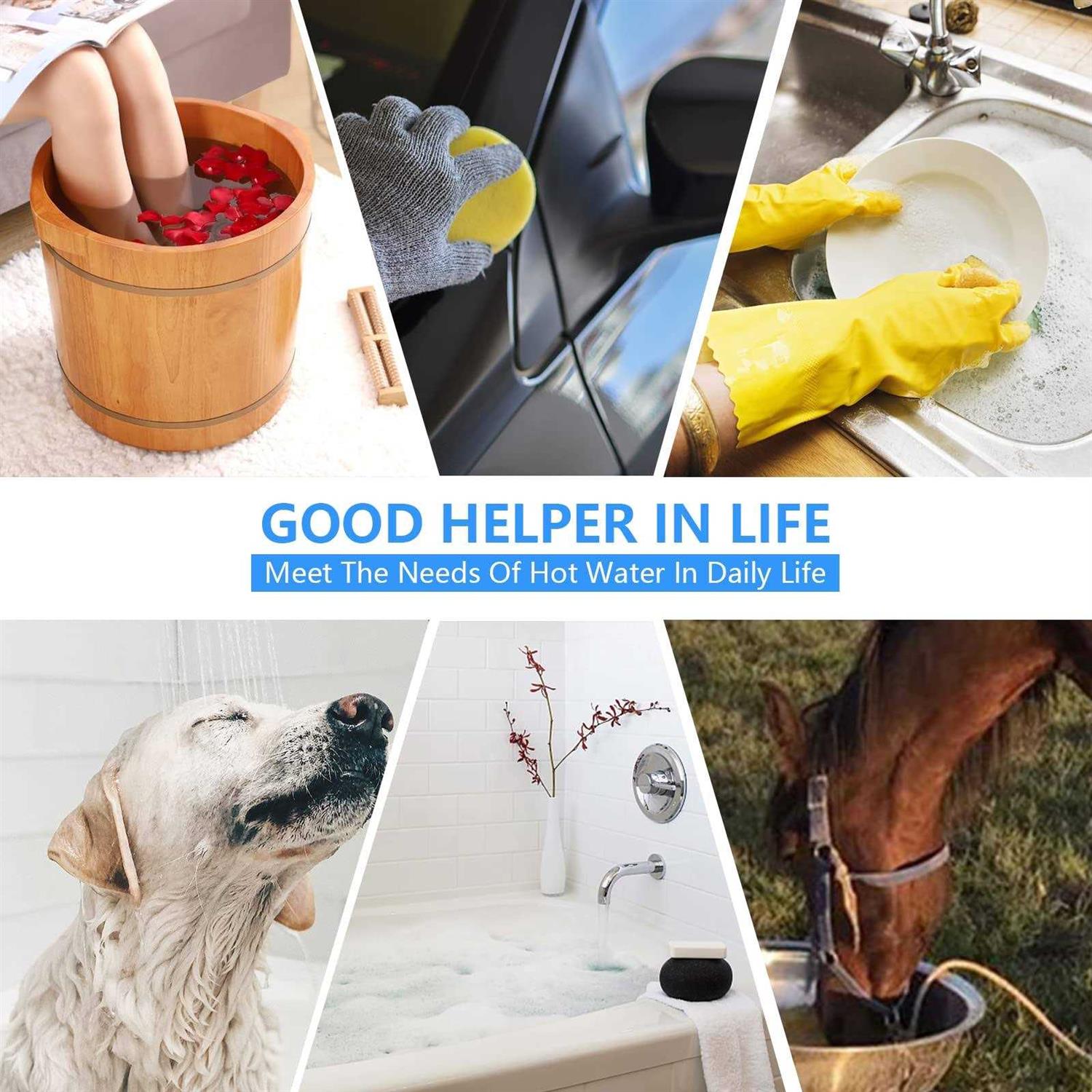 HIGH POWER WATER HEATER- The electric water heater has a power of 2000W and a voltage of 110-125V. It will quickly heat 5 gallons of water with high power in a few minutes, and it will take about 30 minutes to heat the water to 104 degrees Fahrenheit (longer in winter). INTIMATE DESIGN- The immersion electric heater has a 304 stainless steel cover to prevent the heating element from directly contacting people and causing burns. The annular heating tube is much longer than other products, which means that the surface load tube is smaller, so it is safer and more durable. Portable design, you can enjoy hot water anytime and anywhere. WIDELY USED- Immersed electric water heaters can be used for different size containers such as barrels, basins, bathtubs, sinks, etc. Different from ordinary bucket heaters, this water heater is lighter and smaller in appearance, and is very suitable for concrete work, farm, car snow removal, wallpaper, winter washing, camping, travel, etc. GREAT GIFT- “What will you get” 1 x submersible water heater, 1 x digital thermometer, 1 x stainless steel cleaning ball, 1 x sandpaper, 1 x user manual. This is a special gift for your friends and family in winter. The electric heater will warm your world! AFTER SALES- Please follow the instructions and precautions before using your immersion water heater. The outside of the heating tube of the bucket water heater is made of stainless steel anti-scalding cover, and the bottom is also designed for anti-scalding. There is no need to worry about the heating tube directly contacting the container wall and scalding the plastic container. 2000W immersion water heater for heating buckets, basins, tubs, mini inflatable swimming pools, bathtubs, foot tubs, and other containers, a portable bucket water heater with LCD thermometer, stainless steel guard submersible water heater, rapid heating heat 5 gallons of water