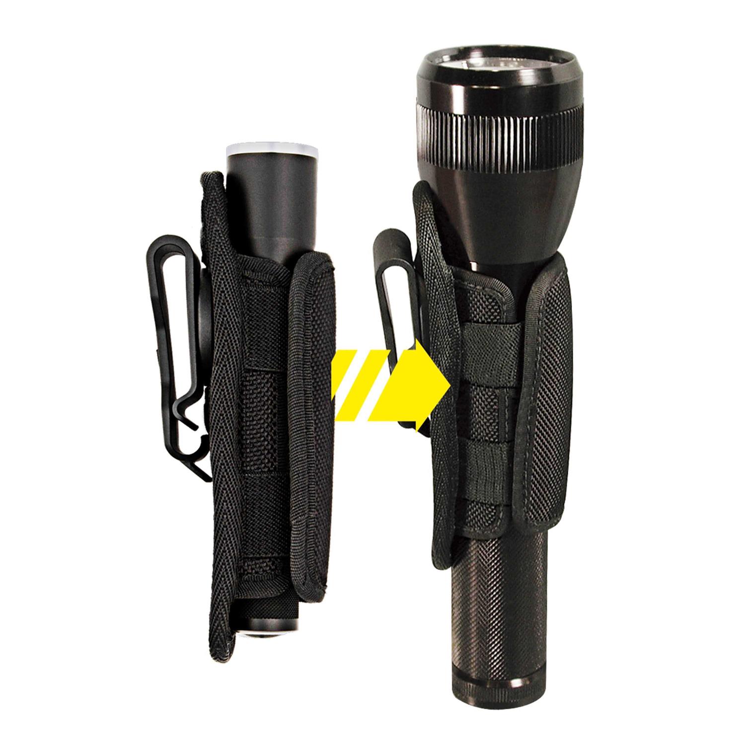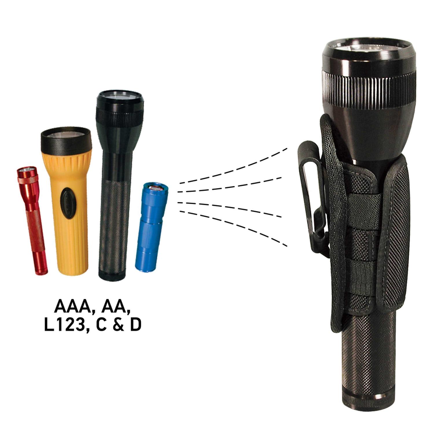 With its two side panels of superior quality elastic, our durable, ballistic nylon Nite Ize Lite Holster Stretch expands to keep flashlights from AAA to D secure and safe at your side. Product Information With its sturdy construction, molded foam insulation, and high-quality elastic side panels, our Lite Holster Stretch keeps flashlights of nearly every size safe at your side. In its relaxed state, a mini AAA flashlight is snug and secure, and the panels expand to provide a close fit for larger flashlights up to and including wide D cell models. Because its “over and under” clip rotates 360 degrees and locks in eight different positions, our Lite Holster Stretch also doubles as a useful hands-free device – angle up to see, read, or work with both hands on anything above waist level, or downward to illuminate your footpath in dim light. Open-ended design allows easy access to the flashlight’s tail cap switch.