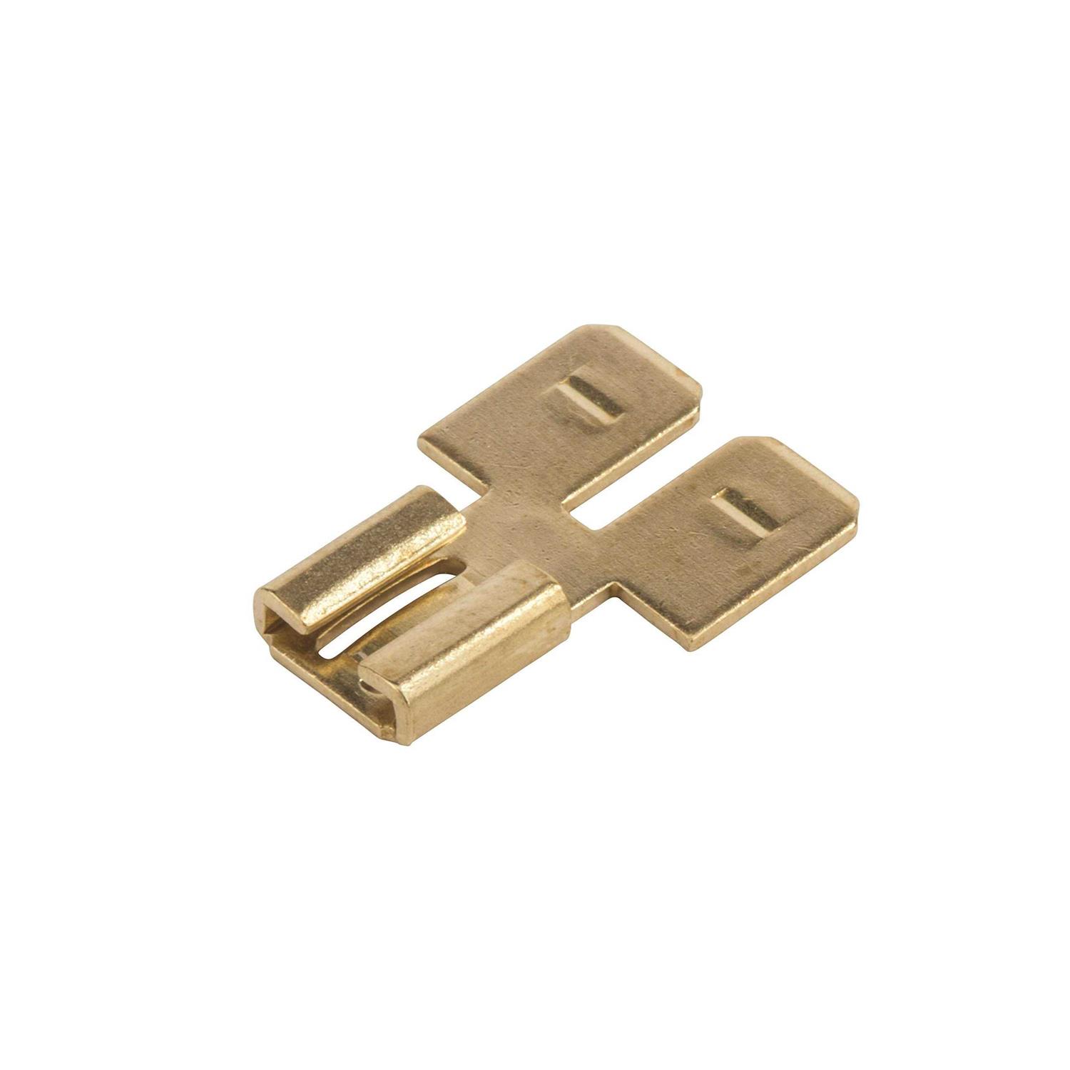 NSI Non insulated double male tab in brass color is made of brass for corrosion resistance. It has a tab size of 0.25 Inch x 0.32 Inch and is reliable at a voltage rating of 600 Volts. It has a temperature rating of 105 deg C and includes 3 terminals. It is ideally used for wire termination in multiple electrical applications. Double male tab is cULus listed.