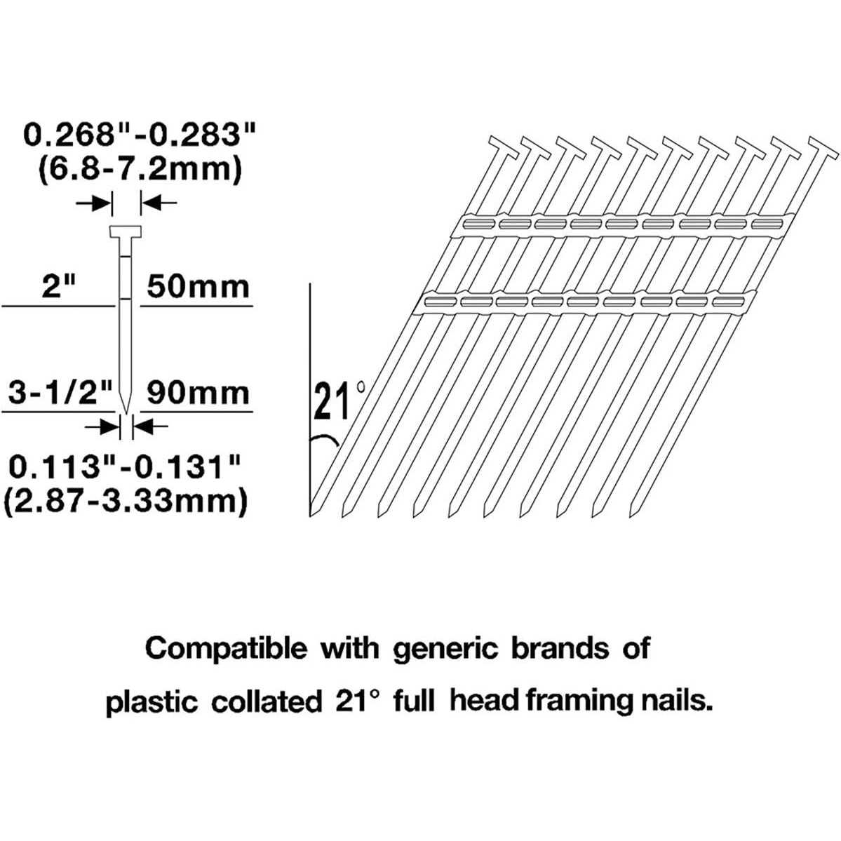 - Compatible Nails: 21 degree plastic collated full round head framing nails from 2″ – 3-1/2″ L and 0.113″ – 0.131″ diameter