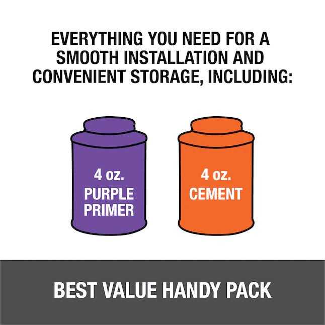 Ideal size for most pipe installations. Convenient “Handy Pack” for storage andndash; just add pipe and fittings. For CPVC, PVCConvenient “Handy Pack” for storage andndash; just add pipe and fittingsIdeal size for most pipe installationsContains one 4 ounce can of PVC Cement and one 4 ounce can of NSF Purple Primer.