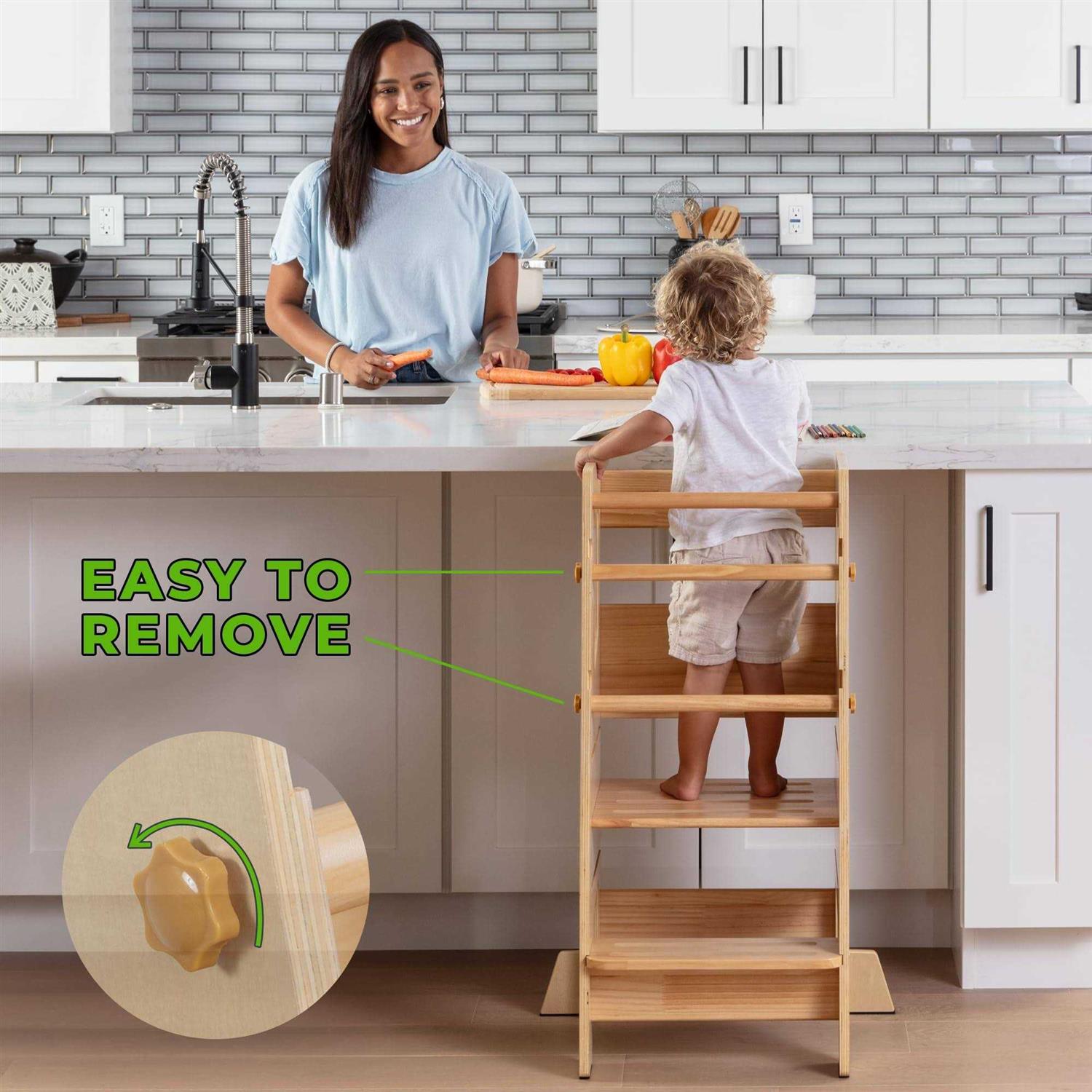 Top 4 Reasons To Choose Our Tower: 1. SAFETY granted by the enclosed structure and 3 safety bars at the back. 2. STYLE – adjustable height and slim design created to fit even smaller spaces 3. NO SLIPPING – little one can safely use the tower while wearing socks 4. NO SCRATCHING – comes with protection for the feet, so your floor will be safe as well