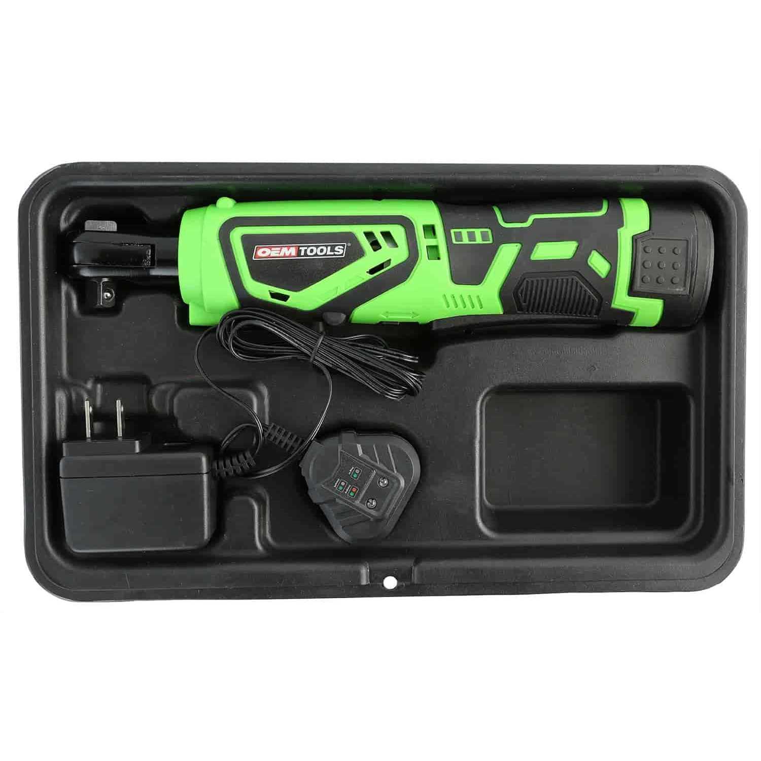 The OEMTOOLS Cordless Power Ratchet is compact, lightweight, and gets the job done. The electroplated cordless wrench ratchet gearhead carries a reverse/forward switch for removing and installing bolts. The battery wrench’s LED light turns on with the trigger to illuminate your compact workspace. The electric ratchet battery is a 2.0 Ah Li-Ion Battery with AC Charger. The 12v ratchet’s battery charges within 5 to 6 hours and completely charges at 7 hours. Battery indicator lights tell you when your 12 volt ratchet is due for a recharge.