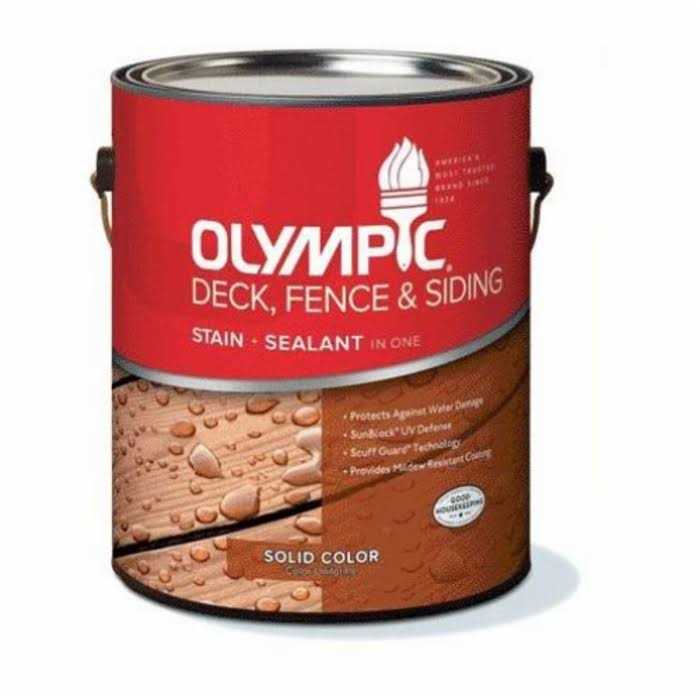 Olympic Wood Protector Solid Wood Stain provides a waterproofing protection with a rich, opaque color that allows the wood texture to show, enhancing the natural beauty of wood. Our formulation of 100% Acrylic resins guarantees Olympic beauty and protection. Recommended for use on exterior wood decks, fences, siding, railings, outdoor furniture and other wood surfaces. Stir thoroughly before and often during use. When using more than one can of the same color, intermix to ensure color uniformity. Apply two coats. When spraying or rolling, always backbrush for best results.