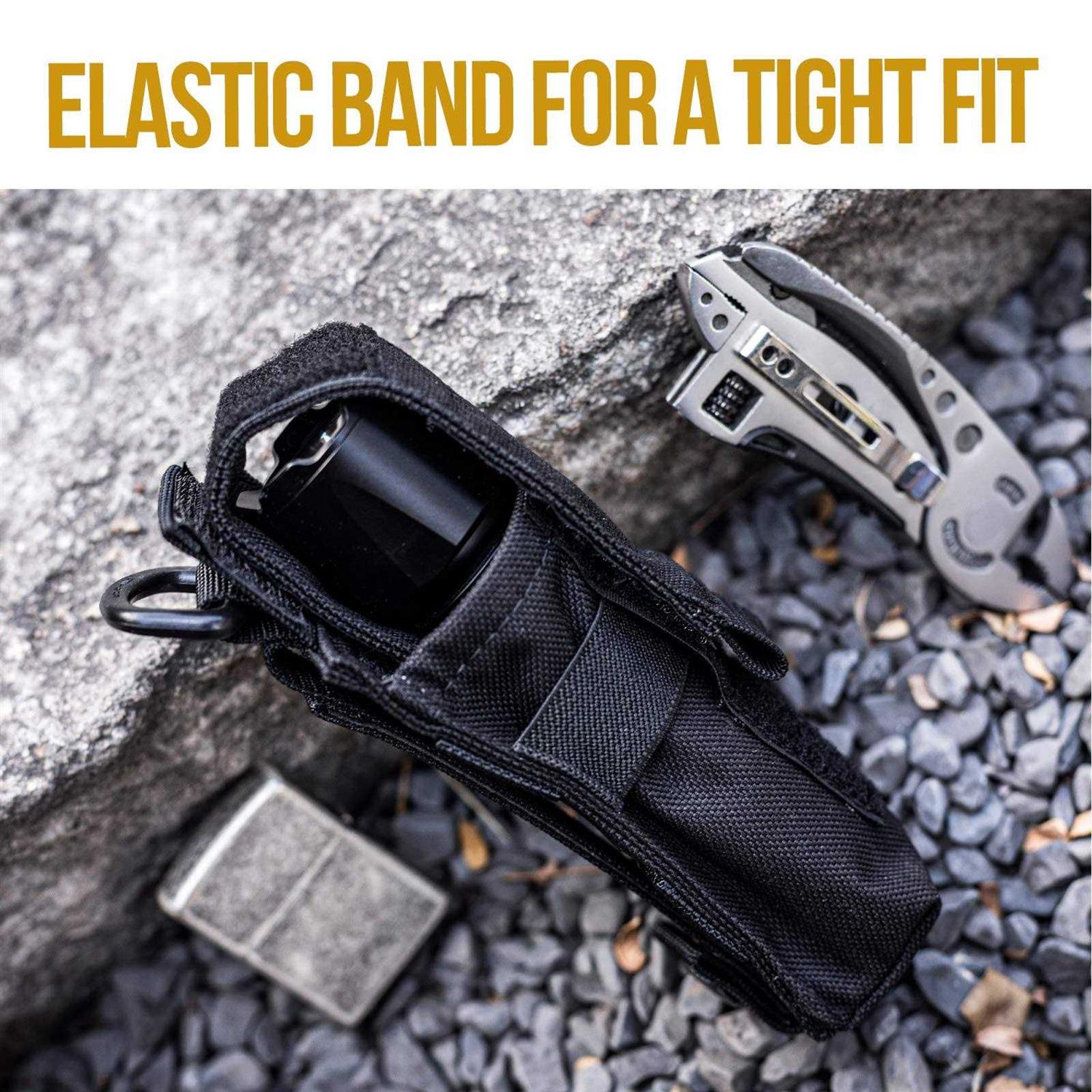 【HEAVY DUTY CONSTRUCT】OneTigris Flashlight Holder is made from 1000D Cordura Nylon for extra durability and water/dirt/abrasion resistance; Felt lined interior for good protection and scratch prevention. 【CONVENIENT TO CARRY】MOLLE Tactical Flashlight Holster is compatible with webbing and the snap-buttoned strap is suitable for fixing onto your belt, vest or pack. 【VERSATILE TOOL HOLDER】Flashlight Holster fits Fenix TK09 TK15 TK15C PD32 PD35 LD12 LD22 SD10 E20 E25 E35 E35-UE. 【ADJUSTABLE FLASHLIGHT HOLDER 】Adjustable Hook & loop Flashlight Holster for Belt to hold varying tools. 【FUNCTIONAL DESIGN】UTX-Duraflex D-ring at the top of molle flashlight Holster and a grommeted drainage hole at the bottom of tactical flashlight pouch. Note:Only a flashlight holster, anything else is not included. Why Choose OneTigris Hook & Loop Flashlight Pouch? A simple design that just works. Featuring Cordura Nylon for extra durability and dirt resistance, felt lined interior for solid scratch-free protection, and MOLLE compatibility to fix onto your belt or gear. Specifications Material: 1000D Cordura Nylon, UTX-Duraflex D-ring Dimensions:6.2”*2”*2”/16cm*5cm*5cm Weight: 2.64oz/75g Package Includes OneTigris Molle Flashlight Pouch *1