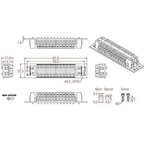 16Amp 48V 2×12 position screw terminal block distribution module. Support for multiple module extension connections. Rated current 16 Amp(total input or output), Maximum voltage 48V A / B terminal blocks, Pitch 7.5mm/0.295″, Wire range 26AWG ~ 12AWG / 2.5mm square. Rated current 16Amp. Strip length 7mm. Screws – M3,steel, Cr3+ Zn plated. Pin header and Cage – Brass. A1~B6 / A7~B12 terminal blocks, Pitch 5.0mm/0.197″, Wire range 26AWG ~ 12AWG / 2.5mm square. Rated current 16Amp. Strip length 7mm. Screws – M3,steel, Cr3+ Zn plated. Pin header and Cage – Brass. UL CE CQC certified terminal blocks, FR-4 glass fiber PCB. p 1, 16Amp 48V 2×12 position screw terminal block distribution module. Support for multiple module extension connections. br 2, Rated current 16 Amp(total input or output), Maximum voltage 48V. br 3, A / B terminal blocks, Pitch 7.5mm/0.295″, Wire range 26AWG ~ 12AWG / 2.5mm square. Rated current 16Amp. Strip length 7mm. Screws – M3,steel, Cr3+ Zn plated. Pin header and Cage – Brass. br 4, A1~B6 / A7~B12 terminal blocks, Pitch 5.0mm/0.197″, Wire range 26AWG ~ 12AWG / 2.5mm square. Rated current 16Amp. Strip length 7mm. Screws – M3,steel, Cr3+ Zn plated. Pin header and Cage – Brass. br 5, UL CE CQC certified terminal blocks, FR-4 glass fiber PCB. /p