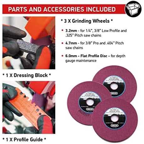 Built-in light. Self-centering chain vise and customizable vise handle positioning. Hands-free clamp vise operation for faster grinding. Sharpens 1/4″, 3/8″ low profile, 0.325″, full profile 3/8″ and. 404″ pitch chain.