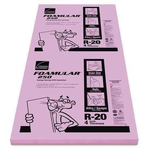 Owens Corning FOAMULAR 250 Extruded Polystyrene (XPS) Insulation is a closed-cell, moisture-resistant rigid foam board well suited to meet the needs for a wide variety of building applications. FOAMULAR 250 XPS insulation board is great for many residential and commercial construction applications such as wall furring, perimeter/foundation, cavity wall, pre-cast concrete, under a slab, crawl spaces, sheathing, and other applications. Thickness Sq Ft Per Board R-Value 3/4″ 32 Sq Ft R4 1″ 32 Sq Ft R5 1.5″ 32 Sq Ft R7.5 2″ 32 Sq Ft R10 2.5″ 32 Sq Ft R12.5 3″ 32 Sq Ft R15 4″ 32 Sq Ft R20 Features Excellent long-term stable insulating performance at R-5 per inch Exceptional moisture resistance, long-term durability Lightweight, durable rigid foam panels are easy to handle and install Easy to saw, cut or score Scored Square Edge Applications – Slows the transmission of water vapor and moisture in masonry walls – Provides continuous insulation over wood or steel stud framing, in insulated concrete sandwich panel walls, in masonry unit cavity walls, or when used with non-penetrating, surface mounted furring systems over masonry or concrete walls – Insulates and retains its properties in below-grade perimeter and foundation applications, or directly beneath the concrete slab to complement the insulating sheathing envelope around the building framing – FOAMULAR 250 XPS insulation is great for below-grade applications. FOAMULAR XPS insulation is resistant to degradation from the components of common soils and will retain its insulating performance characteristics even after prolonged exposure to moisture – Extruded Polystyrene Provides a weather-resistant barrier (when joints are sealed) to enhance the building s resistance to air and moisture penetration Product Data Table Property Test Method2 Value Thermal Resistance3, R-Value (180 days) minimum, hrft2F/Btu (RSI, Cm2/W) @ 75F (24C) mean temperature ASTM C518 ” Thickness 4.0 (0.70) 1″ Thickness 5.0 (0.88) 1?” Thickness 7.5 (1.32) 2″ Thickness 10 (1.76) 2?” Thickne