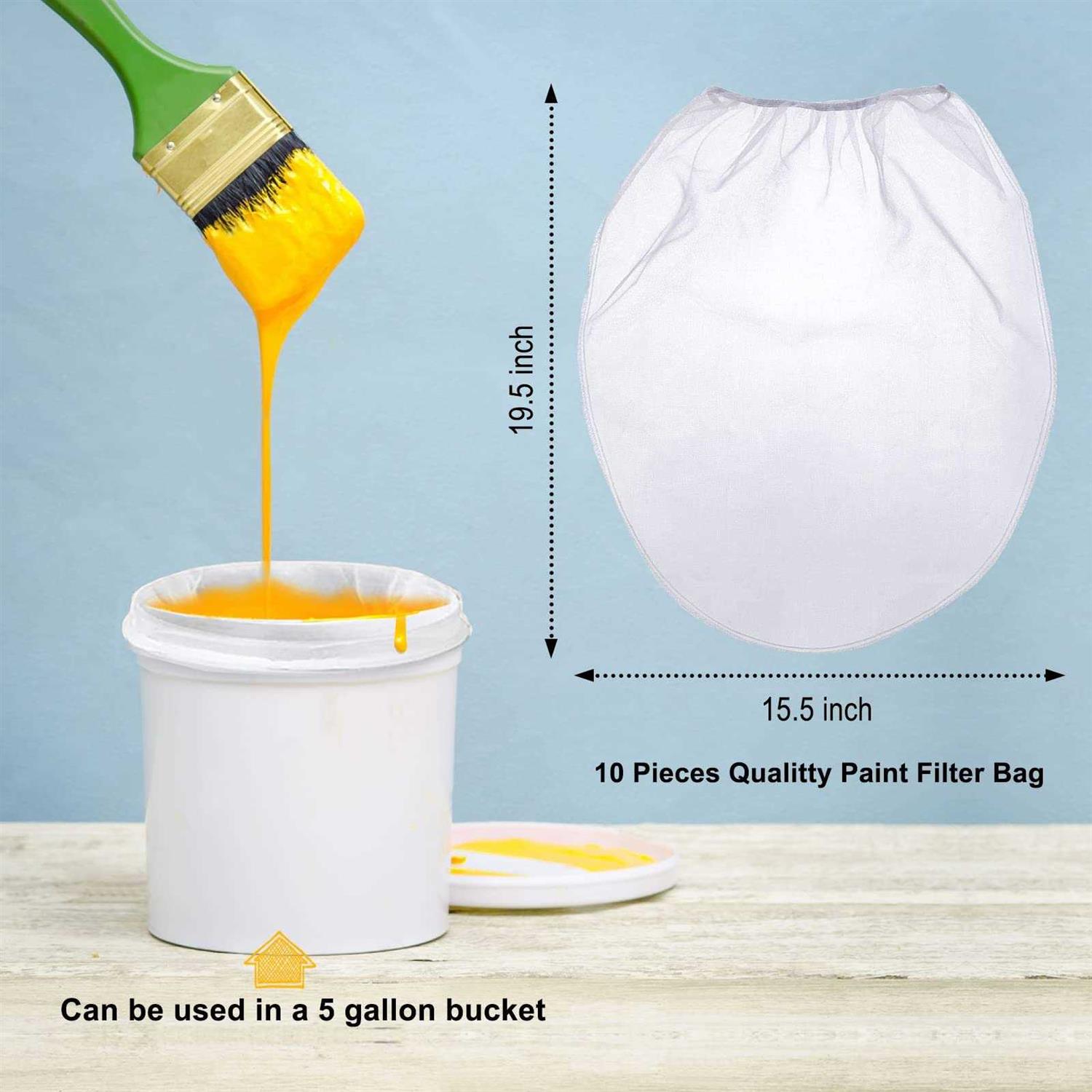 【Required Quantity & Capacity】: You will get 10 pieces paint strainer bag in total, suitable for 5 gallon barrels, which are deep enough and capable of filtering particles larger than 250 μm to meet most of your needs 【Elastic Top Opening】: The specially designed elastic top opening can be applied to all kinds of filter cylinder containers to expand the range of use; Each white fine mesh filters bag adopts special rimming technology in production, so the edge of the bag is tight to prevent leakage of the needle hole 【Durable & Reusable Paint Strainer】: These bags are made of quality nylon material. Durable, sturdy, non-toxic and odorless, safe to use. Allows you to use again and again after cleaning. 【Easy to Use】: The mesh filter bags are waterproof, anti-static and easy to use, which can be directly covered on the barrel and the elastic belt can be fixed on the edge of the barrel. Not easy to tear 【Wide Applications】: This paint strainer bag can be applied for filtering paint, stains and all types of liquids, also suitable for plant protection, aquaculture, beer brewing and other purposes Multi-purpose Paint Strainer Bag: The paint filter strainer helps make the liquid more pure by filtering the particles, lumps and other media in the liquid, can be applied to the paint spraying machine to prevent the paint spraying machine from blocking. What’s more, the bags effectively protect the plants from strong irradiation in hot weather. Sturdy and Easy to Clean: This paint mesh strainer made of nylon is not easy to tear, can filter particles larger than 250 μm per 100 mesh per inch. With special elastic mouth and hemming design, the surface of the filter bag is smooth and easy to clean, which makes them reusable for multiple times. Specifications: Material: nylon Color: white Capacity: 5 gallons Weight: 5.2 ounces Size: approx. 15.7 x 19.7 inches Package Includes: 10 x paint strainer bags Kind Note: Please allow 1 – 2cm size error due to manual measurement.”