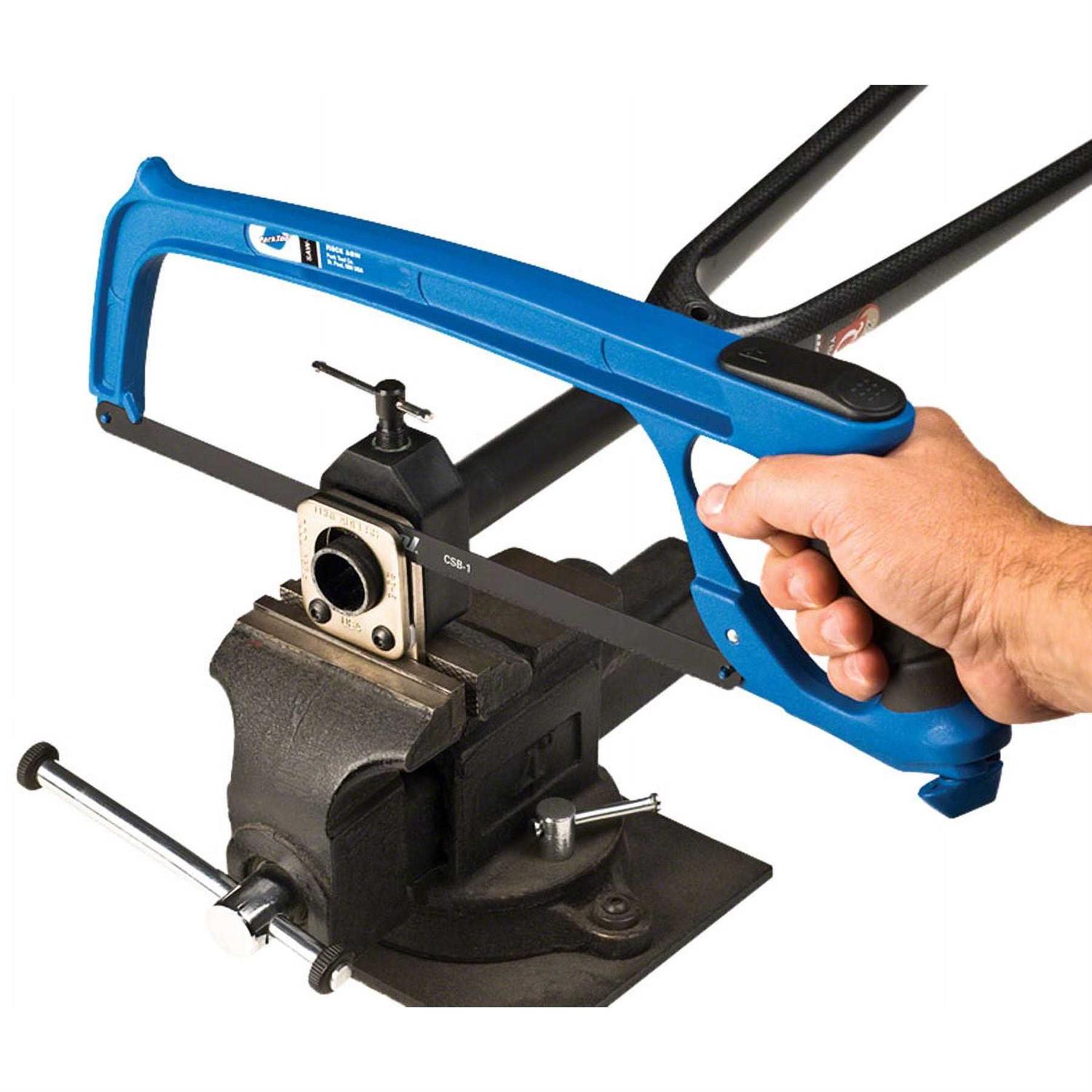 This is the Park Tool CSB-1 Carbon Cutting Saw Blade. 12” Tungsten steel hacksaw blade specially designed to smoothly cut carbon composite handlebars, forks, seat masts, seat posts, etc. Fits Park Tool SAW-1 Hacksaw and most 12” hacksaws and is CSB-1 is designed for use with the SG-8 Saw Guide. NOTE: Similar to a grinding stone, do not use this blade on aluminum.