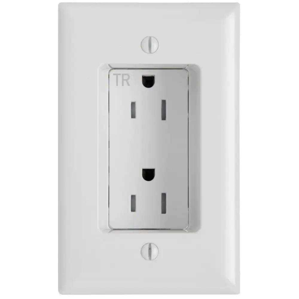 Pass & Seymour TradeMaster Tamper resistant decorator receptacle measures 2.900 Inch x 1.850 Inch x 4.700 Inch and is great for flat screen TVs, furniture pinch points, Kitchen counters and more. Receptacle with a current and voltage rating of 15 Amps and 125 Volts installs on finished wall in standard electrical boxes. It is UL and cUL listed.