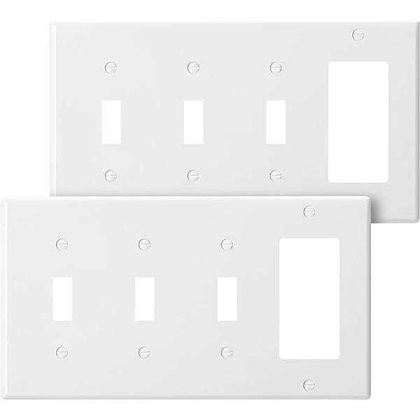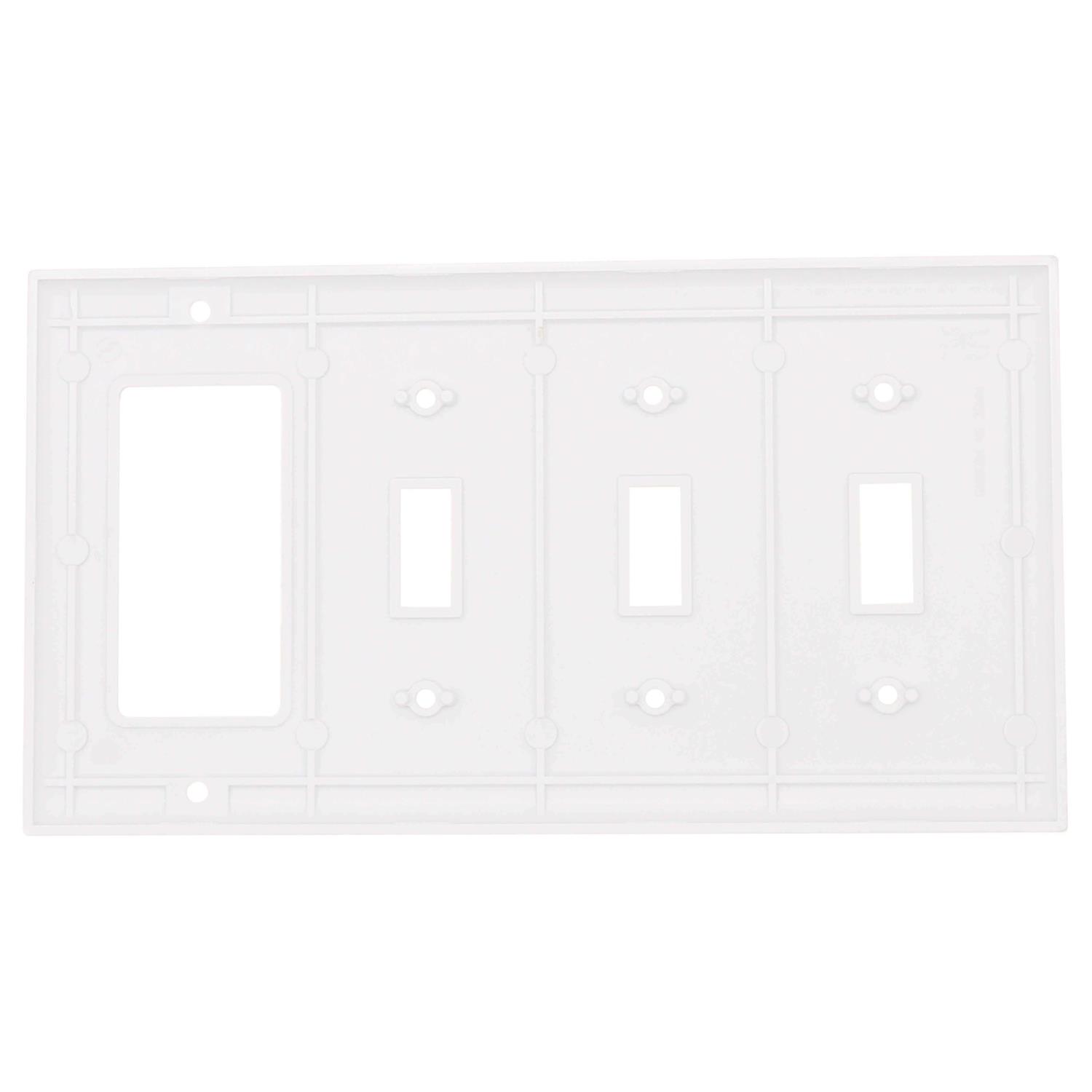 Pass & Seymour 4-Gang Standard size combination opening plate in white color, has non-combustible mar-proof thermoset plastic construction and smooth finish for longer service life. It measures 8.125-Inch x 4.5-Inch x 0.07-Inch. Wallplate is resistant to discoloration, grease, oil, solvent and moisture. Rectangular combination opening plate has horizontal orientation and employs one decorator as well as three toggle switch configuration. It supports screw mounting for easy installation. Combination opening plate is great for residential, commercial, industrial and institutional applications. It comes with color matching screws. Opening plate is UL listed and CSA certified.