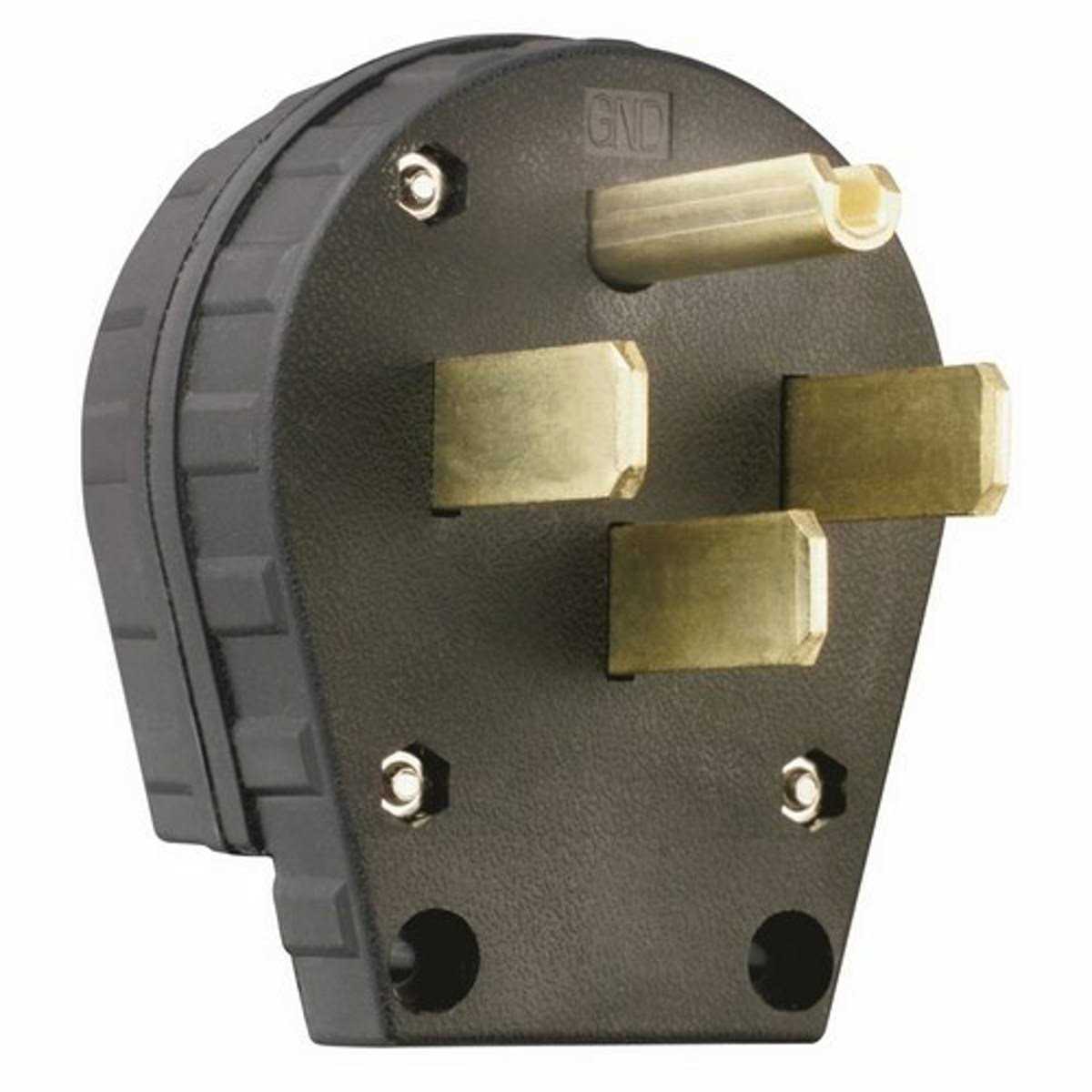 Angled plug in black color is made of nylon that provides extreme durability and strength. It features plastic snap in wire clamp with aluminum conductors that offer high strength. Plug has a configuration of 14-30P, 14-50P. It has a voltage rating of 125/250 volts. Polarized plug measures 2.770″ x 1.360″ x 3.430″. Straight blade plug has a current rating of 30/50 amps.